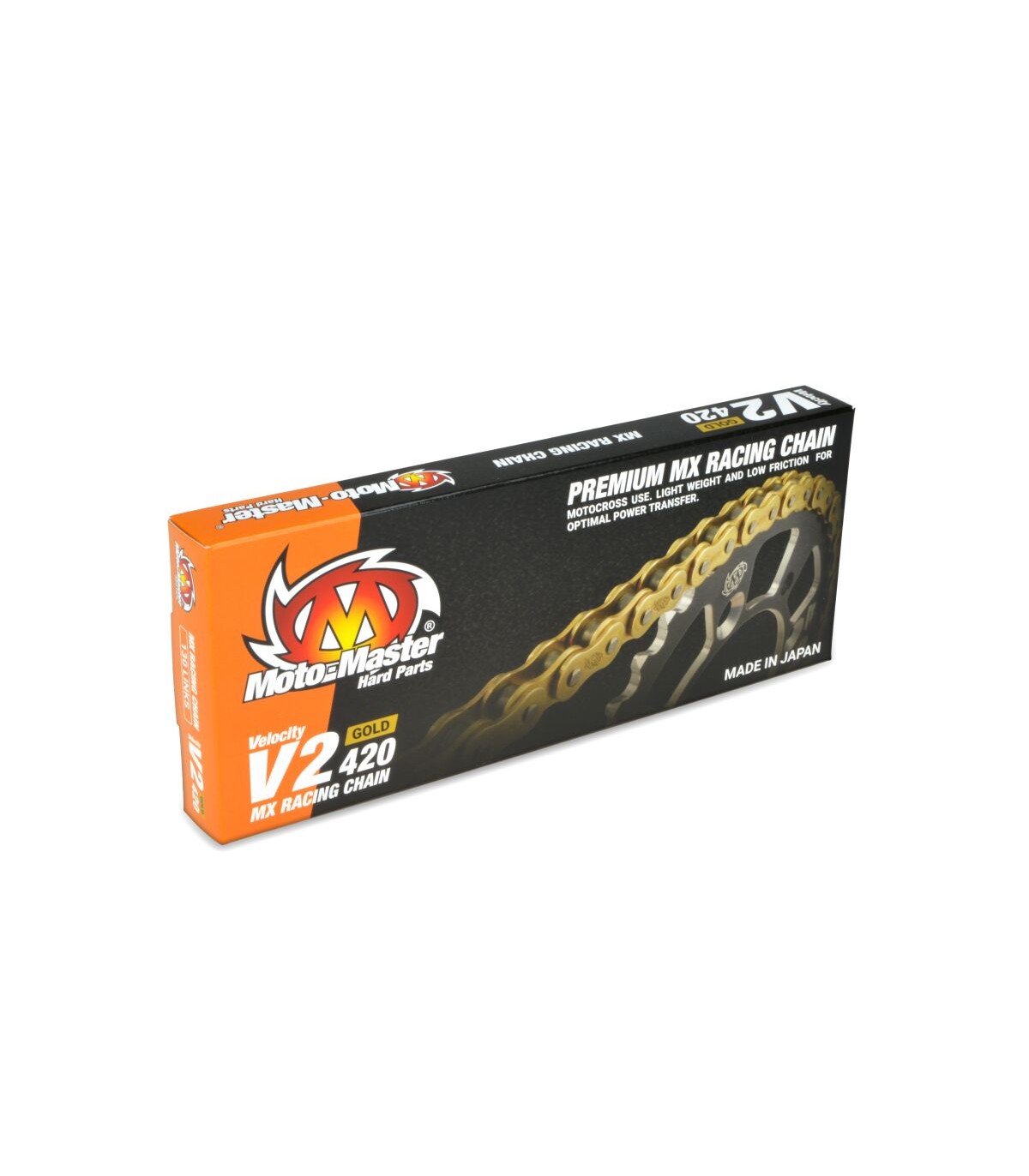 Chaîne de transmission 420 V2Spécialement conçu pour un usage motocrossPoids faible et friction minimale pour un transfert de puissance optimalLes composants pré-étirés se traduisent par des réglages réduits de la chaîne et une durée de vie optimisée du pignonFabriqué au Japon