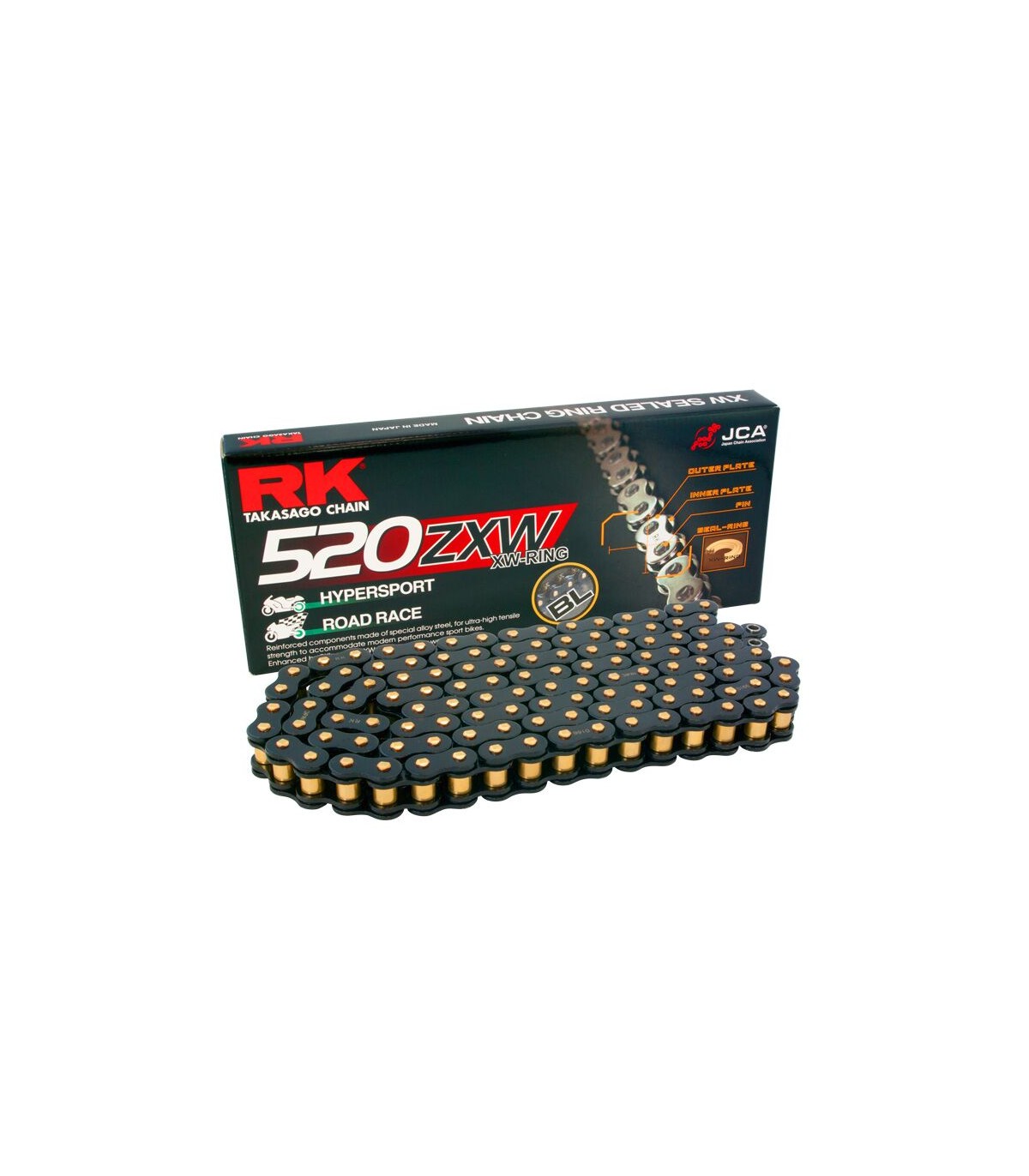 Chaînes 520 ZxwMise au point en tenant compte des spécificités des derniers modèles de moto Superbike de compétitionIncorpore la technologie de joint XW exclusive de RK2 rainures de lubrification et 3 lèvres de contactStructure à triple barrière pour mieux retenir la graisse et pour empêcher les débris de pénétrer dans la chaîneConçue pour être la chaîne la plus solide et la plus durable actuellement commercialiséePrésente la résistance à la tension la plus élevée de tous les produits RK, de même qu’une grande rigidité pour une réactivité instantanée en cas d’accélération