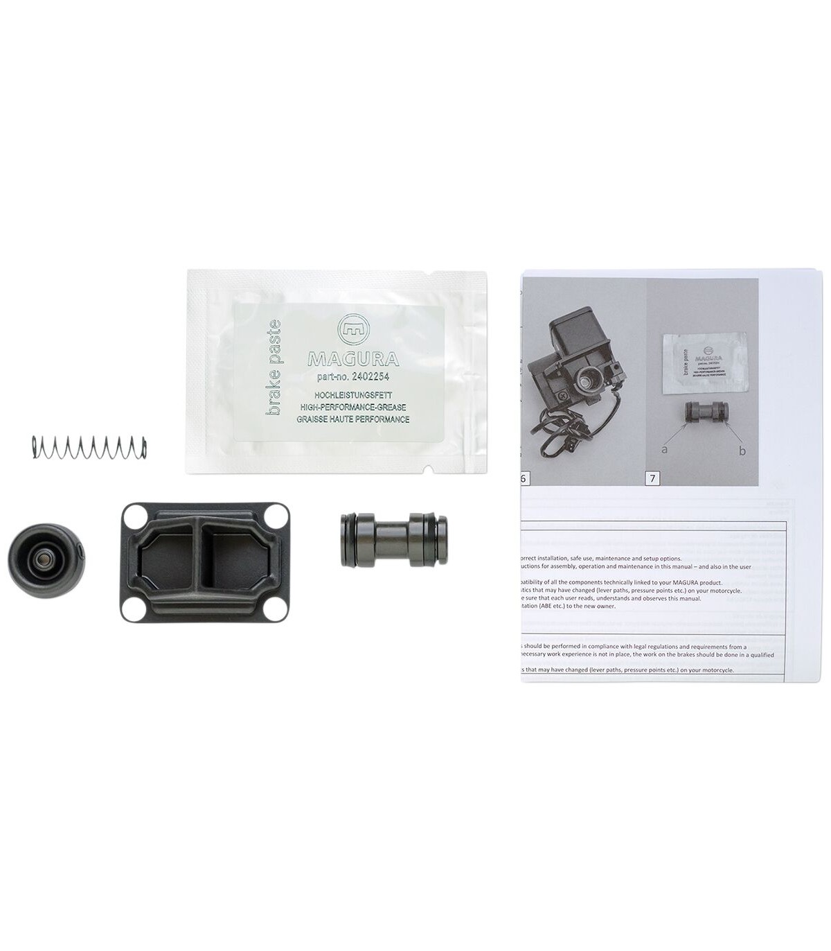Kit de réparation de maître-cylindreTout ce qu’il faut pour une révision complète du maître-cylindreLe kit inclut un piston avec joints et ressort, des soufflets de pistons, des joints-soufflets de réservoir, un joint torique pour une vis de fixation de piston et de la graisse silicone