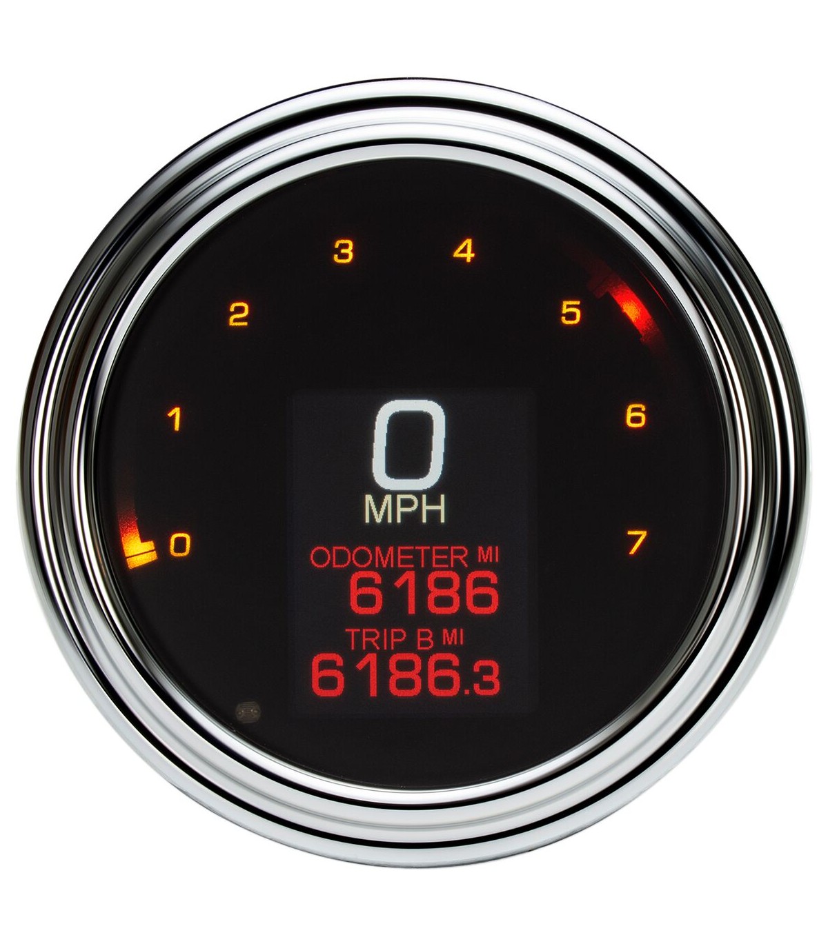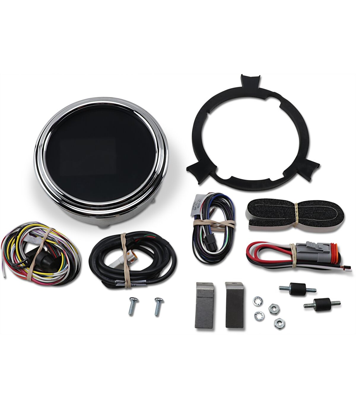 Indicateur MLX-2000Avec compteur de vitesse réglable, compte-tours de type barre, voltmètre, température cylindre (le cas échéant), horloge, rapport engagé, compteur kilométrique avec deux compteurs journaliers, compteur d'entretien et compteur d'heures, plus indicateurs deEffectue les calcule et affiche la mémorisation vitesse élevée/régime élevée, le chronomètre 0-100 km/h, le temps et la vitesse au 1/4-mileVarie automatiquement l'intensité de l'affichage pour un confort de conduite de nuit et dispose d'un mode à contraste élevé pour une excellente visibilité, même à la lumière directe du soleil31 couleurs d’éclairage disponiblesCompatible avec tableaux de bord 4 ½” – 5” d'origine, conçus pour un câblage fixe sur les modèles Harley de 2003 et antérieurs
