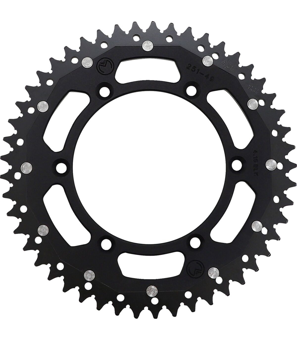 Dual SprocketDesigned to outlast standard aluminum rear sprockets and is much lighter than steel rear sprocketsInner ring is made from 7075 T6 aluminum and the outer ring is made from heavy duty steelSelf-cleaning mud grooves between each tooth to prevent dirt build up