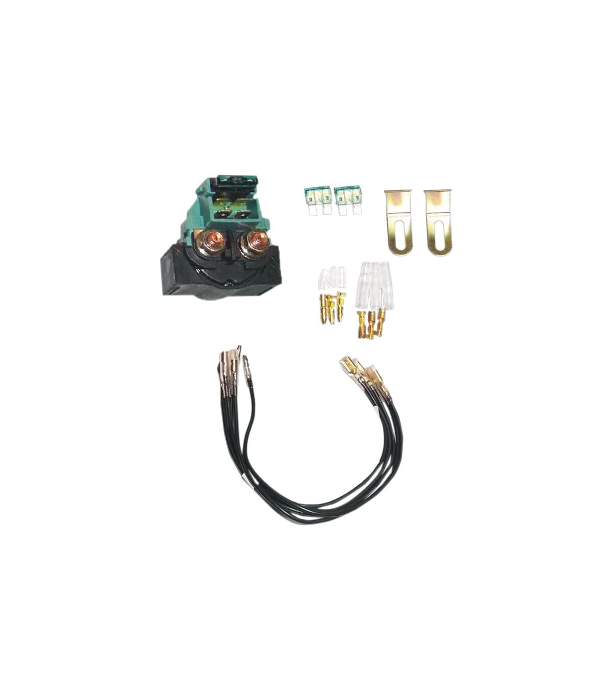 Relais de démarreur universelIntègre un solénoïde 12 VInclut un relais de démarreur, deux pattes de fixation en métal, trois kits supplémentaires de fils de bornes, trois fusibles à lame 30 A supplémentaires et cinq fils avec bornes