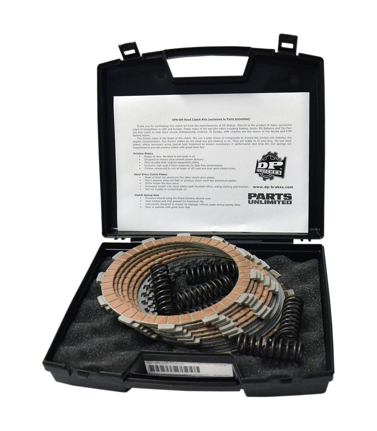 Kit d’embrayage DPKPerformances supérieures aux embrayages OEM ou aftermarketLes kits DPK comprennent des disques garnis, des disques d'embrayage lisses en acier et des ressortsLes kits DPK sont livrés dans une mallette en plastique avec une doublure en mousse protégeant les éléments d'embrayage contre les aléas des transports.Réutilisez la mallette pour transporter des pièces ou des outilsPrêt pour la course - pas besoin de tremper les disques dans l'huile.Excellente transmission de la puissanceMatériaux de friction exclusifs traités thermiquement pour des performances constantesAlliage adapté à la pratique tout-terrain et pour les motos Dual SportPlus durables que les disques OEMDISQUES D'EMBRAYAGE LISSES EN ACIERContrairement aux disques en aluminium d'origine, les disques lisses ne provoquent pas de déformation ou d'usure prématuréeLongue durée de vie – jusqu'à près de 300 % en plus par rapport aux disques d'origineDémarrage facilité grâce à l'augmentation de poids du volant moteur.Pas de pollution de l'huileRESSORTS D'EMBRAYAGEFil en chrome silicium usiné avec précisionTraitement thermique et grenaillage pour une durée de vie maximaleÉvite le patinage de l'embrayageAméliore l'embrayage et les sensations de passage de vitesse.
