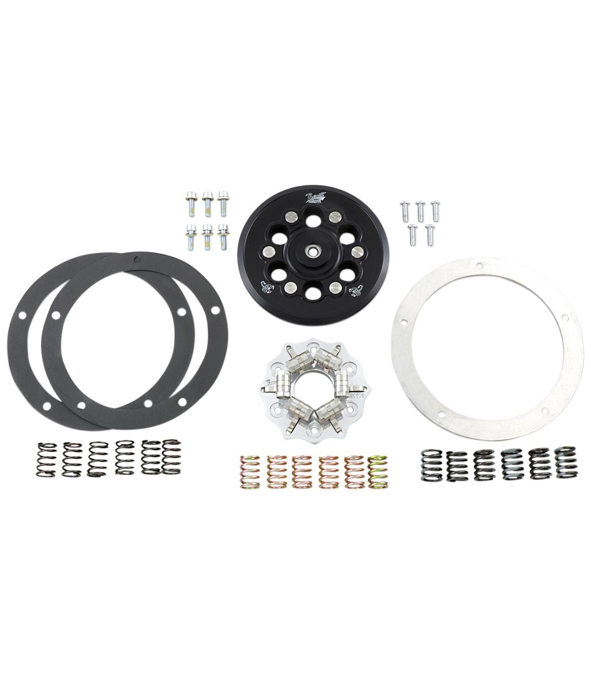 Kit de conversion pour plateau de pression Lock-Up low-profileSpécialement conçu pour une intégration sous les trappes d’embrayage/caches primaires d’origine ou aftermarket. L’utilisation de bras pondérés en acier inoxydable qui intensifient la pression sur l’embrayage à mesure que le nombre de tours par minute augmCeci permet également de maintenir l’effort de levier au minimum, même avec les moteurs coupleuxTrois différents lots de six ressorts (léger, moyen, solide) sont inclus pour une multitude d’options de pression de ressortLe concept de ressort offre un changement de vitesse plus souple et un engagement plus progressif et linéaire comparé au ressort de type diaphragmeInstallation simple à l’aide de boulons, aucune modification n’est requiseFabrication aux États-Unis.Not for '13-'22 models with slipper assist clutch.