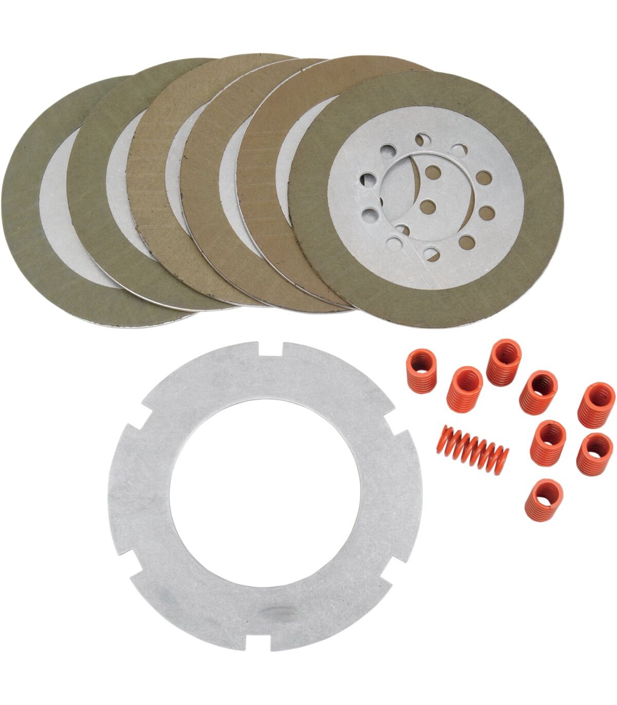 Kit de disques d’embrayage completLe kit comprend six disques garnis en aramide doublés série K, un disque lisse et un lot de ressorts d'embrayage renforcésLe kit ajoute environ 20 % de surface en plusPeut fonctionner à sec ou à l’huileFabrication aux États-Unis.