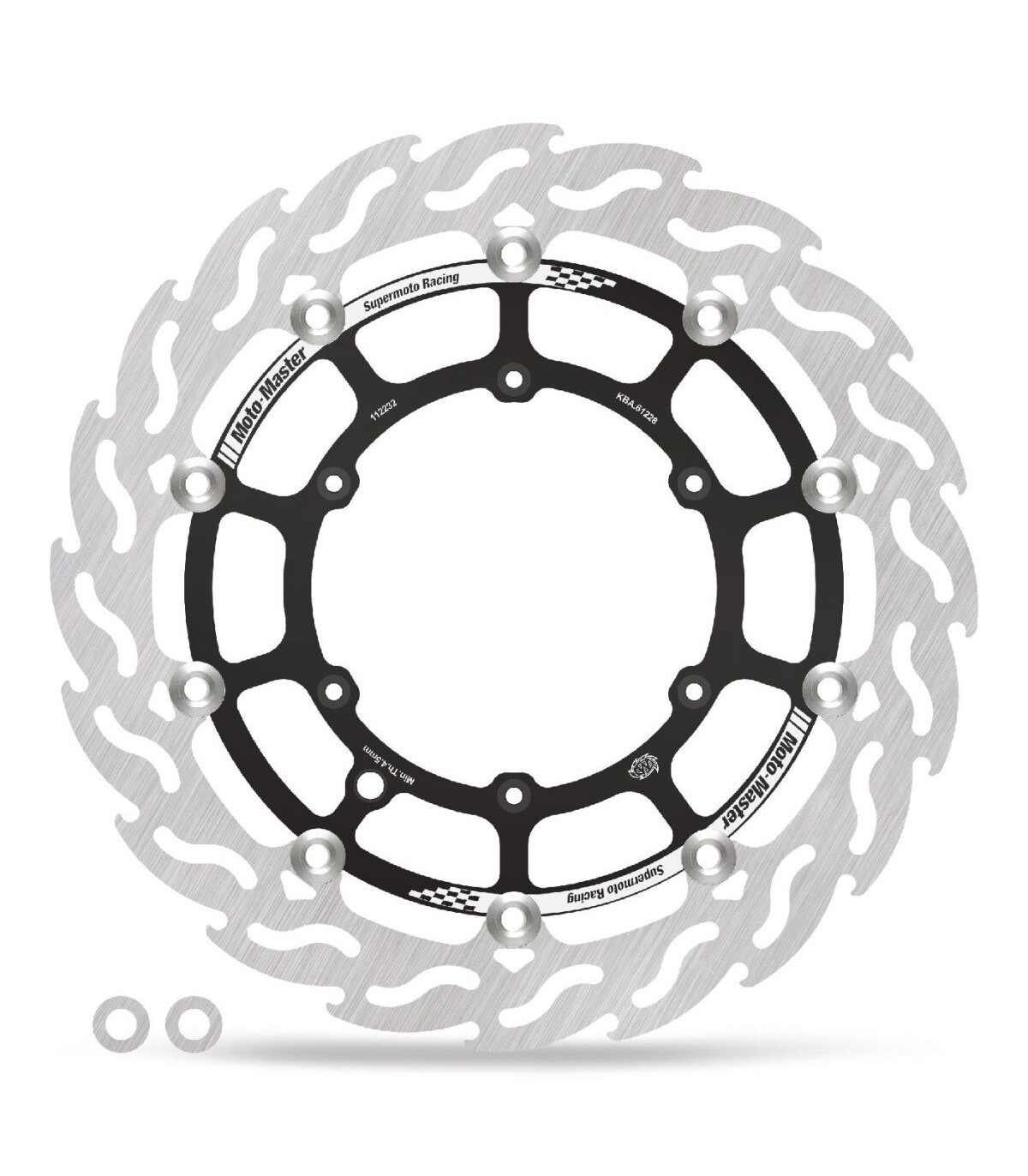 Disques racing avant pour SupermotoLes disques avant flottants de 320 mm au motif de flamme sont spécialement conçus pour être utilisés avec des étriers à 4 pistons Moto-Master et non des pièces d'origineLe support interne est une pièce anodisée en aluminium et l'épaisseur du disque a été augmentée à 5mm, au-delà des disques Standard Supermoto Moto-MasterTous les disques sont soumis à un processus de test vigoureux et sont capables de résister à des températures supérieures à 540 °C (1 004 °F) sans présenter de déformations ou de perte de charge