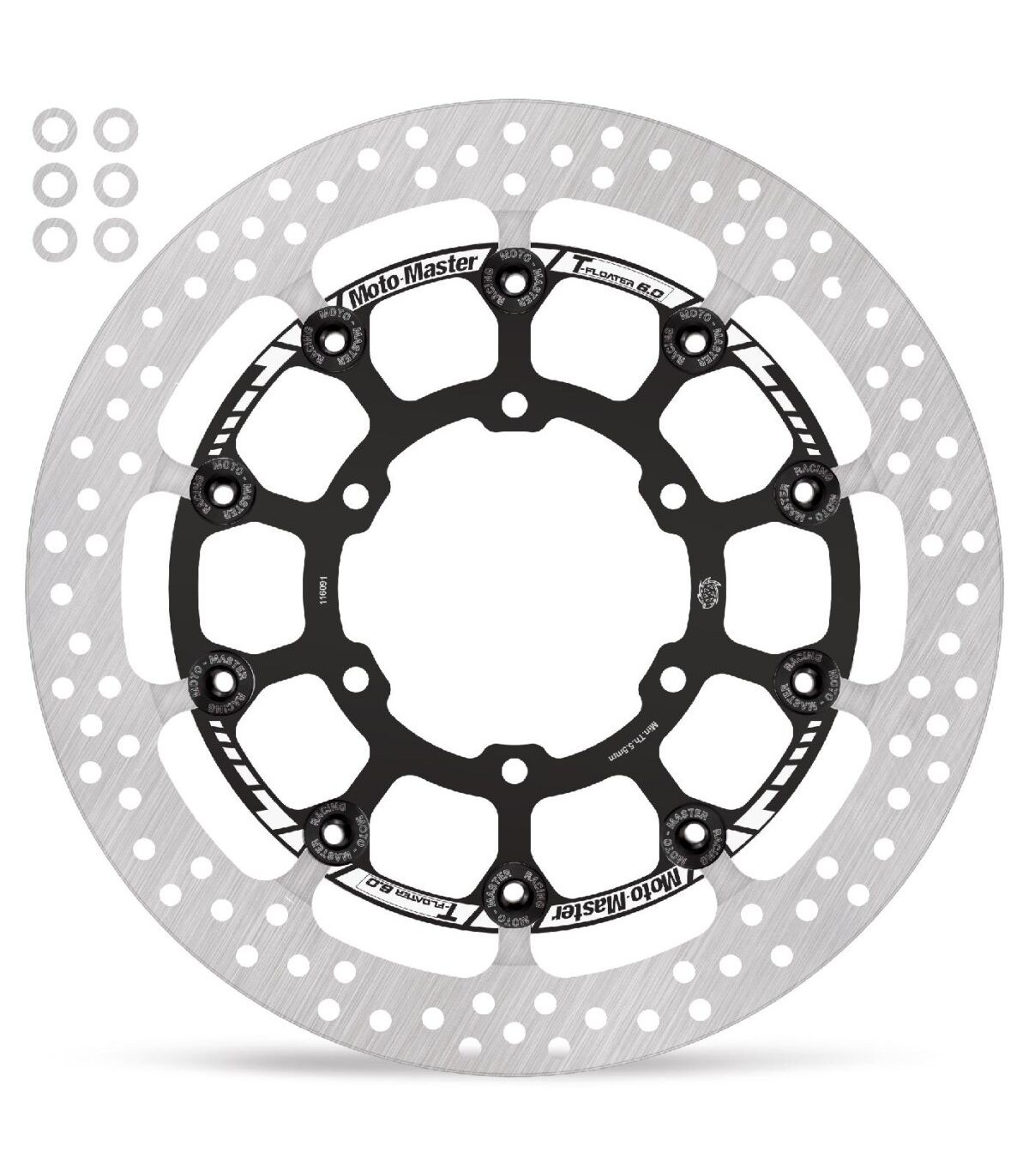 Disque de frein T-Floater série HALOLa conception de l'anneau extérieur HALO assure une dissipation régulière de la chaleur dans des conditions de stress thermique, tout en préservant la propreté de la surface de contact de la plaquette de frein.L'épaisseur de l'anneau extérieur est de 6,0 mm (320 mm) et comporte un trou de refroidissement supplémentaire sur le périmètre extérieur.La partie extérieure découpée au laser et meulée avec précision est fixée à un support en aluminium taillé dans la masse usiné CNC de qualité aéronautique qui est anodisé noir et marqué au laser.Le système T-Floater offre un comportement de flottement contrôlé précis même dans les conditions extrêmes de courseLe design sophistiqué T-Floater permet de résister à de grandes charges mécaniques et de réduire l'usure à un minimumLe système T-Floater est léger grâce à des flotteurs en aluminium anodisé dur spécialement conçus.Brake Rotor Halo T-Floater, Outside Diameter 320mm, Inner Diameter 102,2mm, Thickness 6,0mm, Pitch 120mm