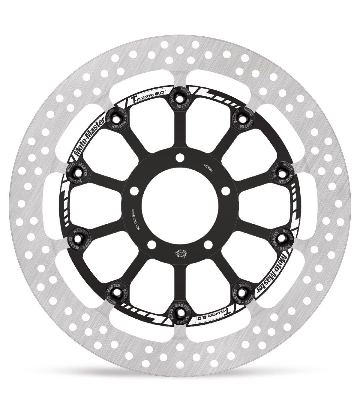 Disque de frein T-Floater série HALOLa conception de l'anneau extérieur HALO assure une dissipation régulière de la chaleur dans des conditions de stress thermique, tout en préservant la propreté de la surface de contact de la plaquette de frein.L'épaisseur de l'anneau extérieur est de 6,0 mm (320 mm) et comporte un trou de refroidissement supplémentaire sur le périmètre extérieur.La partie extérieure découpée au laser et meulée avec précision est fixée à un support en aluminium taillé dans la masse usiné CNC de qualité aéronautique qui est anodisé noir et marqué au laser.Le système T-Floater offre un comportement de flottement contrôlé précis même dans les conditions extrêmes de courseLe design sophistiqué T-Floater permet de résister à de grandes charges mécaniques et de réduire l'usure à un minimumLe système T-Floater est léger grâce à des flotteurs en aluminium anodisé dur spécialement conçus.Brake Rotor Halo T-Floater, Outside Diameter 320mm, Inner Diameter 72mm, Thickness 6,0mm, Pitch 90mm