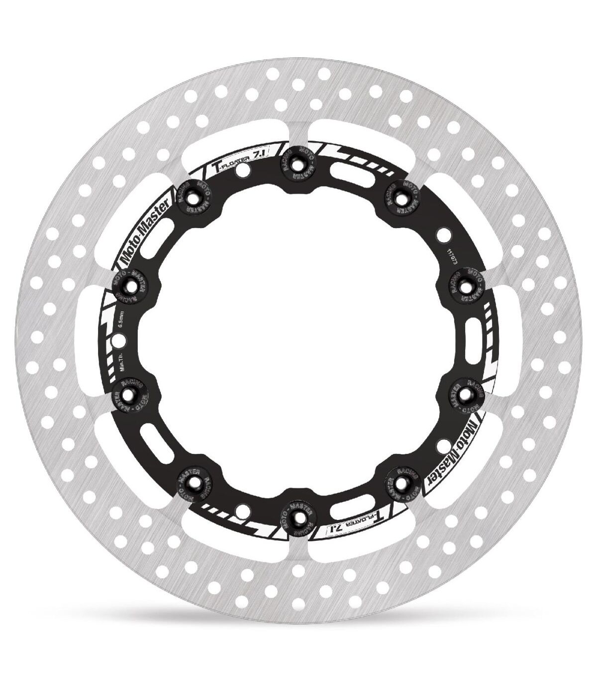 Disque de frein T-Floater série HALOLa conception de l'anneau extérieur HALO assure une dissipation régulière de la chaleur dans des conditions de stress thermique, tout en préservant la propreté de la surface de contact de la plaquette de frein.L'épaisseur de l'anneau extérieur est de 6,0 mm (320 mm) et comporte un trou de refroidissement supplémentaire sur le périmètre extérieur.La partie extérieure découpée au laser et meulée avec précision est fixée à un support en aluminium taillé dans la masse usiné CNC de qualité aéronautique qui est anodisé noir et marqué au laser.Le système T-Floater offre un comportement de flottement contrôlé précis même dans les conditions extrêmes de courseLe design sophistiqué T-Floater permet de résister à de grandes charges mécaniques et de réduire l'usure à un minimumLe système T-Floater est léger grâce à des flotteurs en aluminium anodisé dur spécialement conçus.Brake Rotor Halo T-Floater, Outside Diameter 321mm, Inner Diameter 181mm, Thickness 7,1mm, Pitch 203mm