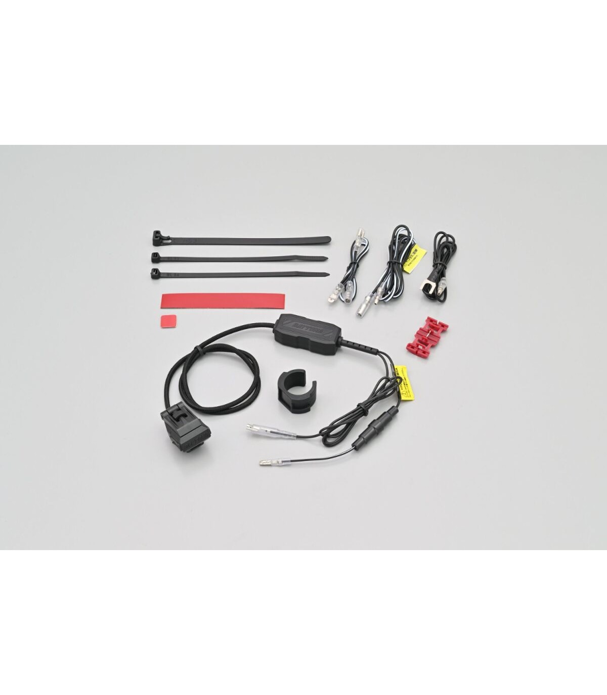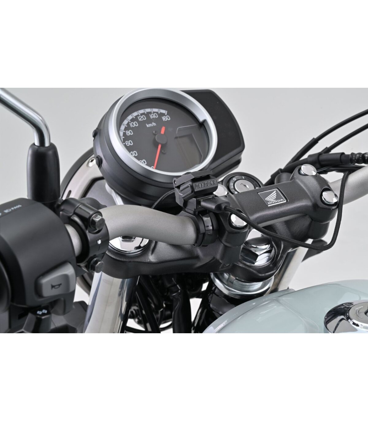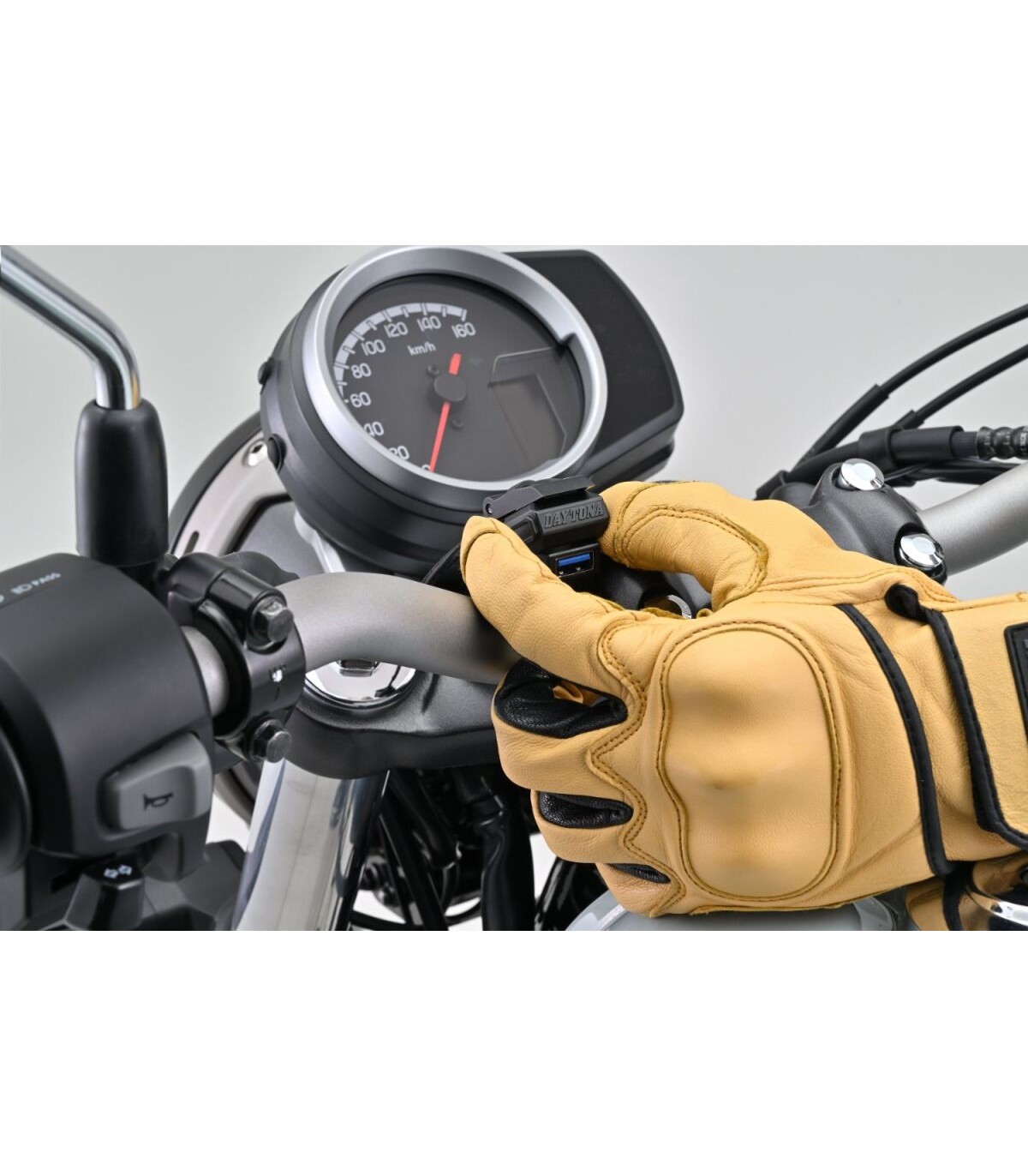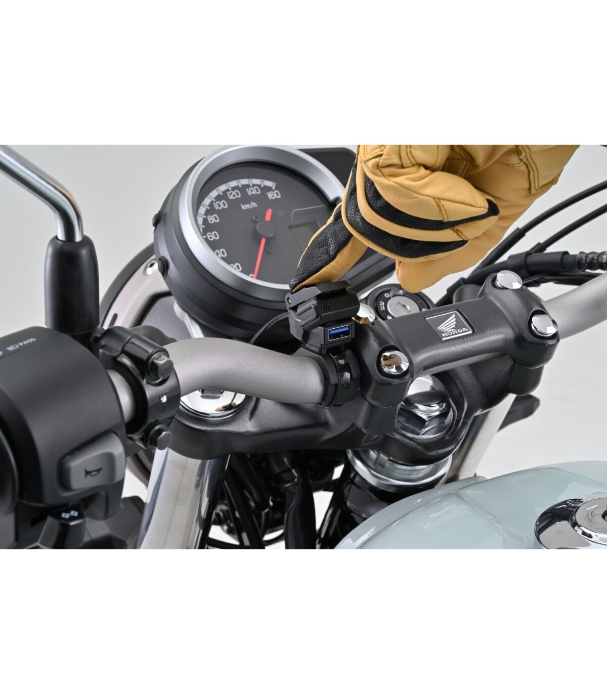 QUICK CHARGE PORT USB TYPE-APower supply for motorcycle handlebar with 1 QC3.0 (QuickCharge) USB-A port.Housing material: ABSInput: DC12.5V (range: DC12-16V)Output 5V/3A, 9V/2A, 12V/1.5AMax. 30WFits for 22.2mm and 25.4mm handlebarsPowers on with ignition key
