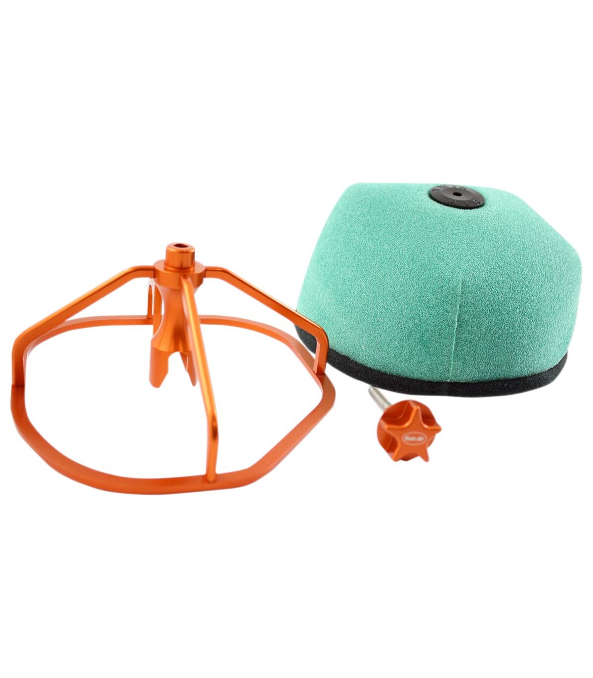 Kit PowerflowAssociation d'un filtre Twin Air plus grand et d'une bride extrêmement légère qui se fixe à la boîte à air afin d'éviter les fuites et offrir plus d'air pour plus de puissanceChaque kit contient le matériel de fixation nécessaire, un filtre à deux temps Twin Air, des brides en billette et/ou une cage métalliqueLe filtre se retire facilement pour les opérations de nettoyage et de maintenance