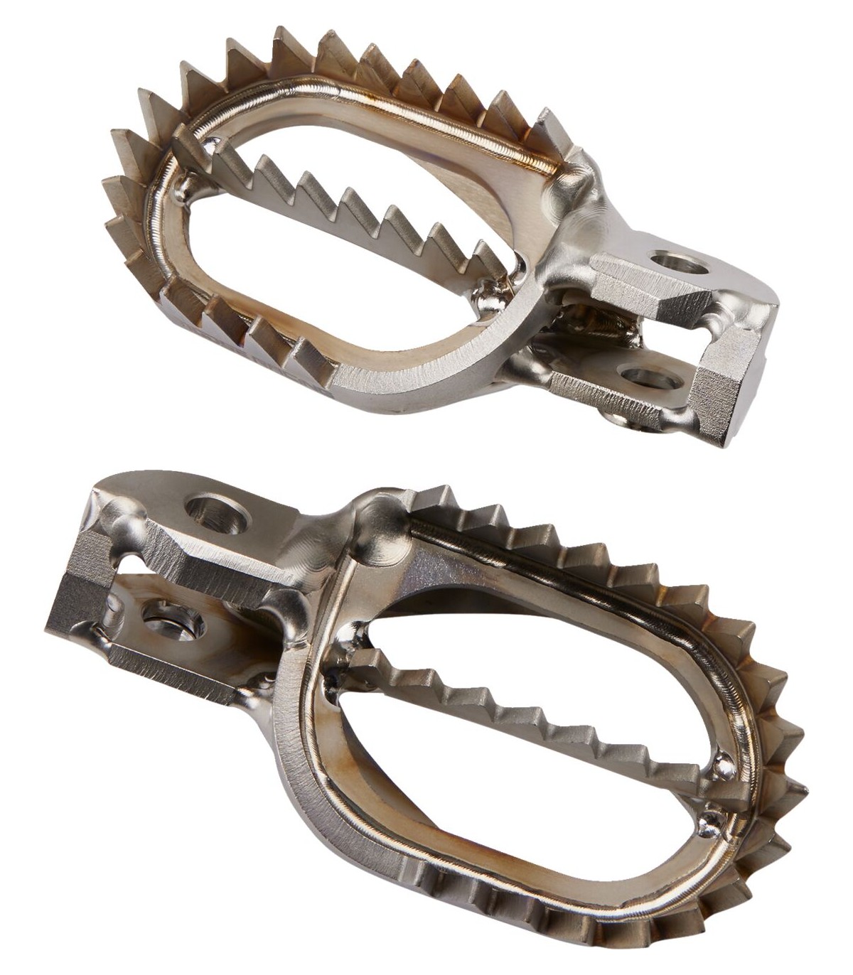 Titanium FootpegsMade from aerospace-grade titanium Grade 5 Ti-6AL-4V with chamber-controlled welding57 mm cleated platform provides ample surface area and support for the most aggressive ridingSuper lightweight coming in under 300 grams per setInner cleated webbing design provides added traction surface and strength to the foot pegsBeveled front and rear edge, prevents pegs from hanging up in deep ruts