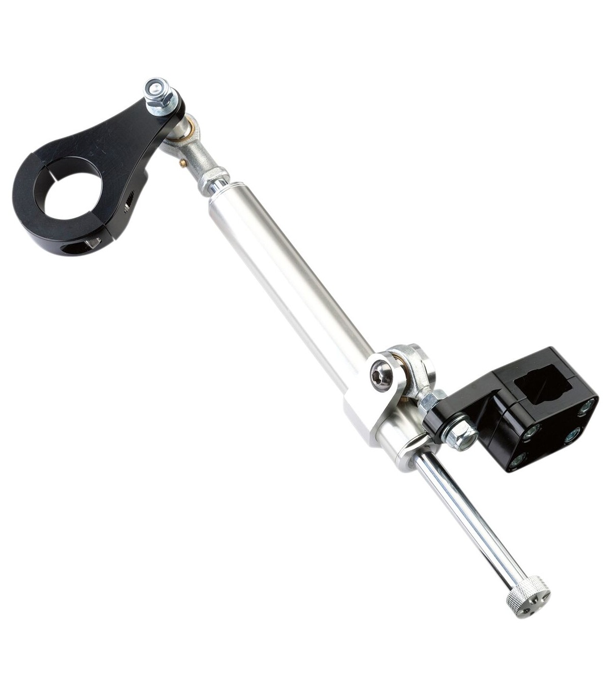 Amortisseur de direction à 7 positions de réglageCompression ajustable sur 7 niveaux de douce à dureConstruction en aluminiumLes embouts taillés dans la masse protègent les joints contre la saleté et la bouePoignée d'ajustage et collier de serrage pour le corps en aluminium taillés dans la masseColliers de fixation en aluminium taillés dans la masseFabrication aux États-Unis