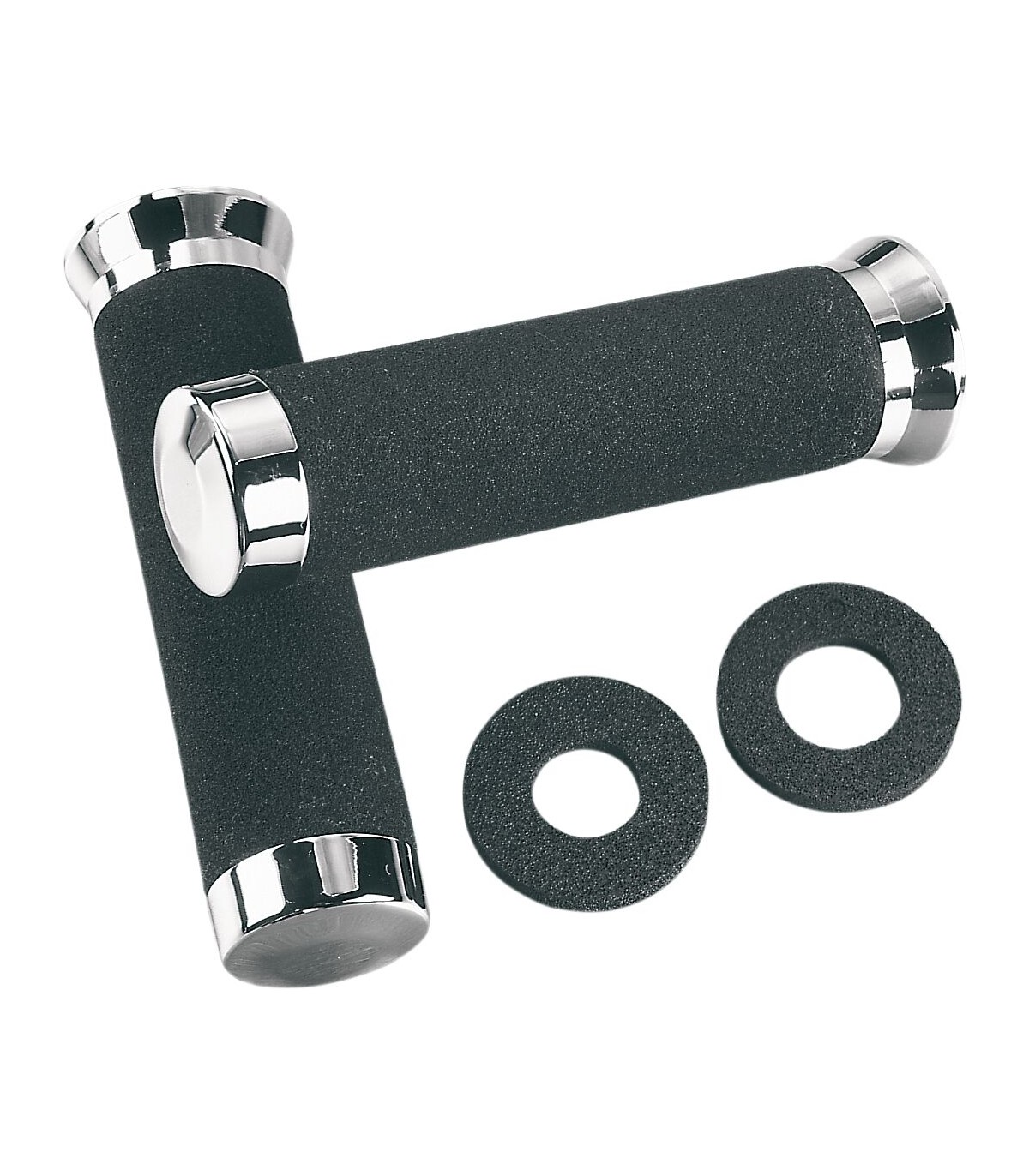 Poignées Sundance®Poignées en mousse plus dense pour des sensations plus fermes et une performance qui dure plus longtempsLes manchons sont en thermoplastique moulé ; le cache est en néoprène luxueux remplaçableRésistantes à la transpiration, au carburant et à l’huileNoires avec embouts chromés