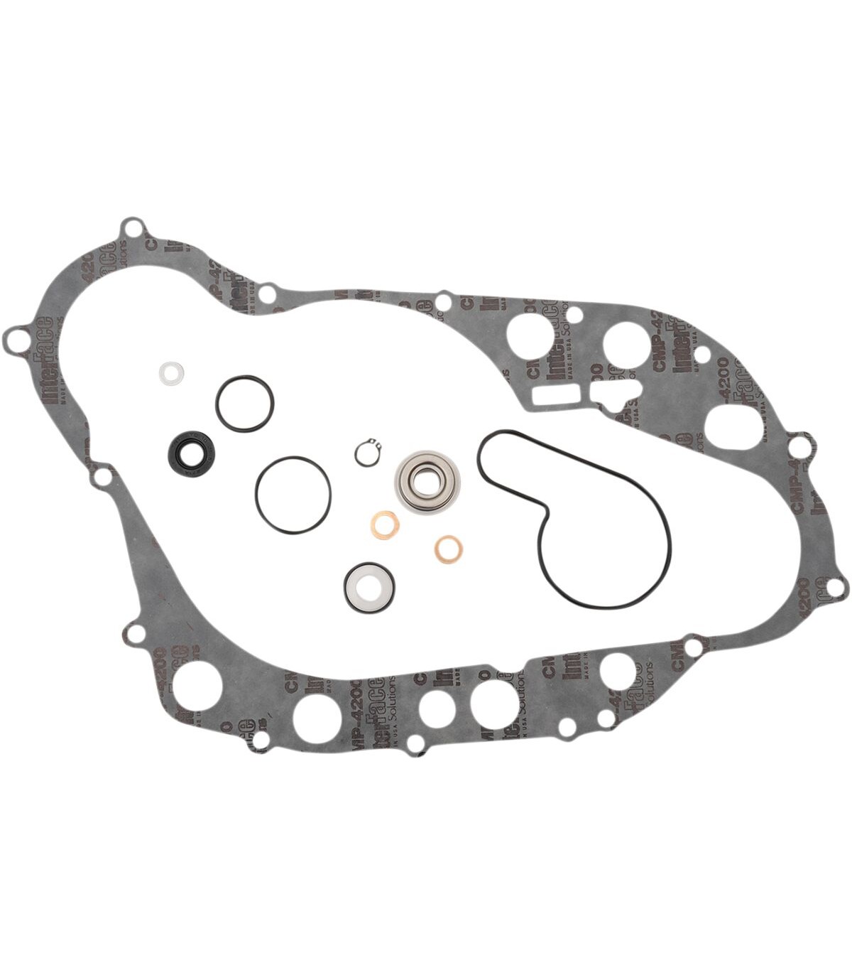 Kit réparation pompe à eauRenferme tous les joints, joints toriques, roulements et joints spy nécessaires pour réparer une pompe à eauLe kit contient les éléments suivants : roulements le cas échéant, joints en caoutchouc, joint de pompe à eau mécanique le cas échéant, joint de carter latéral, joint de pompe à eau, circlips sur l’axe de pompe à eau et joints de vidange en cuivre.