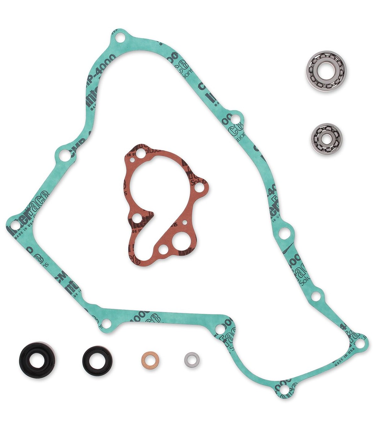 Kit réparation pompe à eauRenferme tous les joints, joints toriques, roulements et joints spy nécessaires pour réparer une pompe à eauLe kit contient les éléments suivants : roulements le cas échéant, joints en caoutchouc, joint de pompe à eau mécanique le cas échéant, joint de carter latéral, joint de pompe à eau, circlips sur l’axe de pompe à eau et joints de vidange en cuivre.