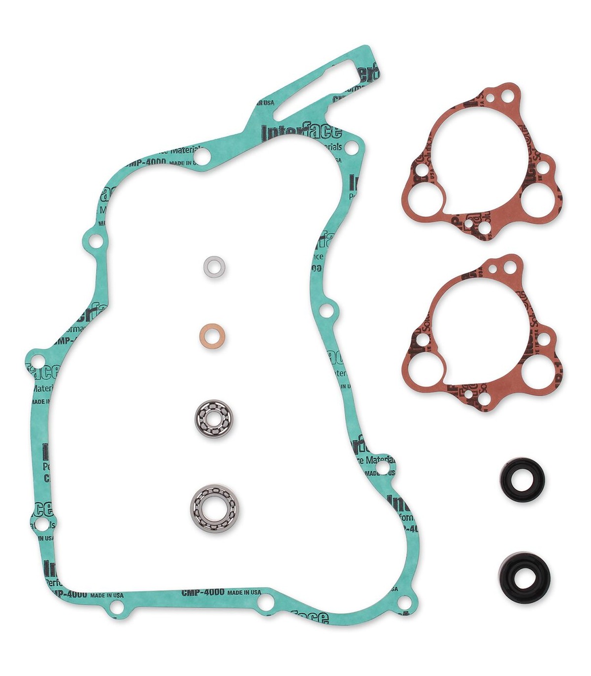 Kit réparation pompe à eauRenferme tous les joints, joints toriques, roulements et joints spy nécessaires pour réparer une pompe à eauLe kit contient les éléments suivants : roulements le cas échéant, joints en caoutchouc, joint de pompe à eau mécanique le cas échéant, joint de carter latéral, joint de pompe à eau, circlips sur l’axe de pompe à eau et joints de vidange en cuivre.