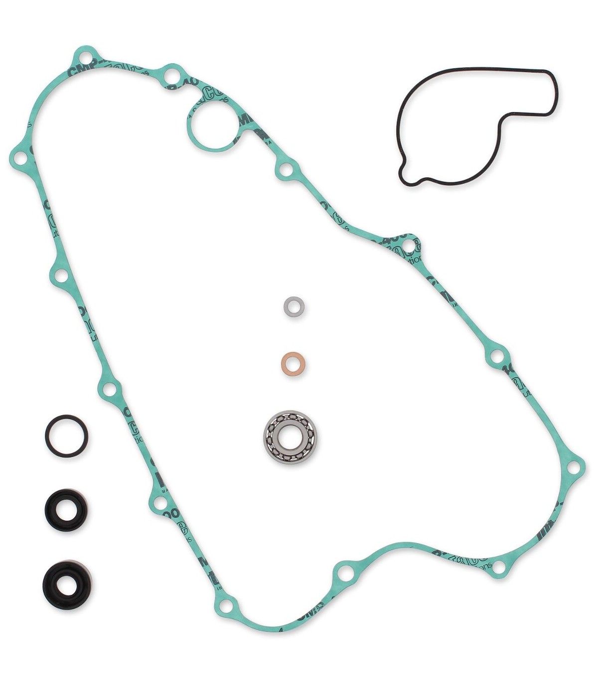 Kit réparation pompe à eauRenferme tous les joints, joints toriques, roulements et joints spy nécessaires pour réparer une pompe à eauLe kit contient les éléments suivants : roulements le cas échéant, joints en caoutchouc, joint de pompe à eau mécanique le cas échéant, joint de carter latéral, joint de pompe à eau, circlips sur l’axe de pompe à eau et joints de vidange en cuivre.
