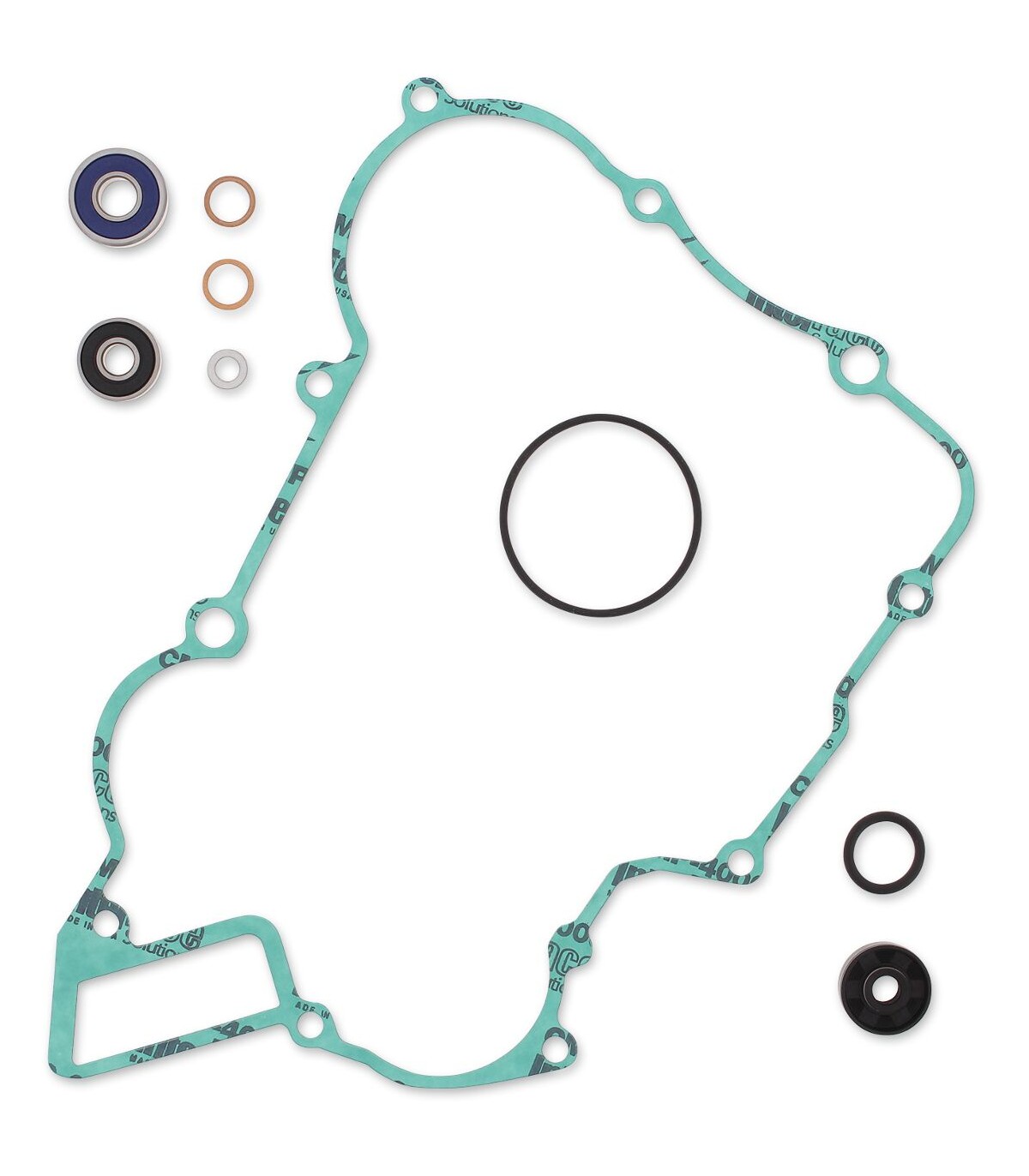 Kit réparation pompe à eauRenferme tous les joints, joints toriques, roulements et joints spy nécessaires pour réparer une pompe à eauLe kit contient les éléments suivants : roulements le cas échéant, joints en caoutchouc, joint de pompe à eau mécanique le cas échéant, joint de carter latéral, joint de pompe à eau, circlips sur l’axe de pompe à eau et joints de vidange en cuivre.