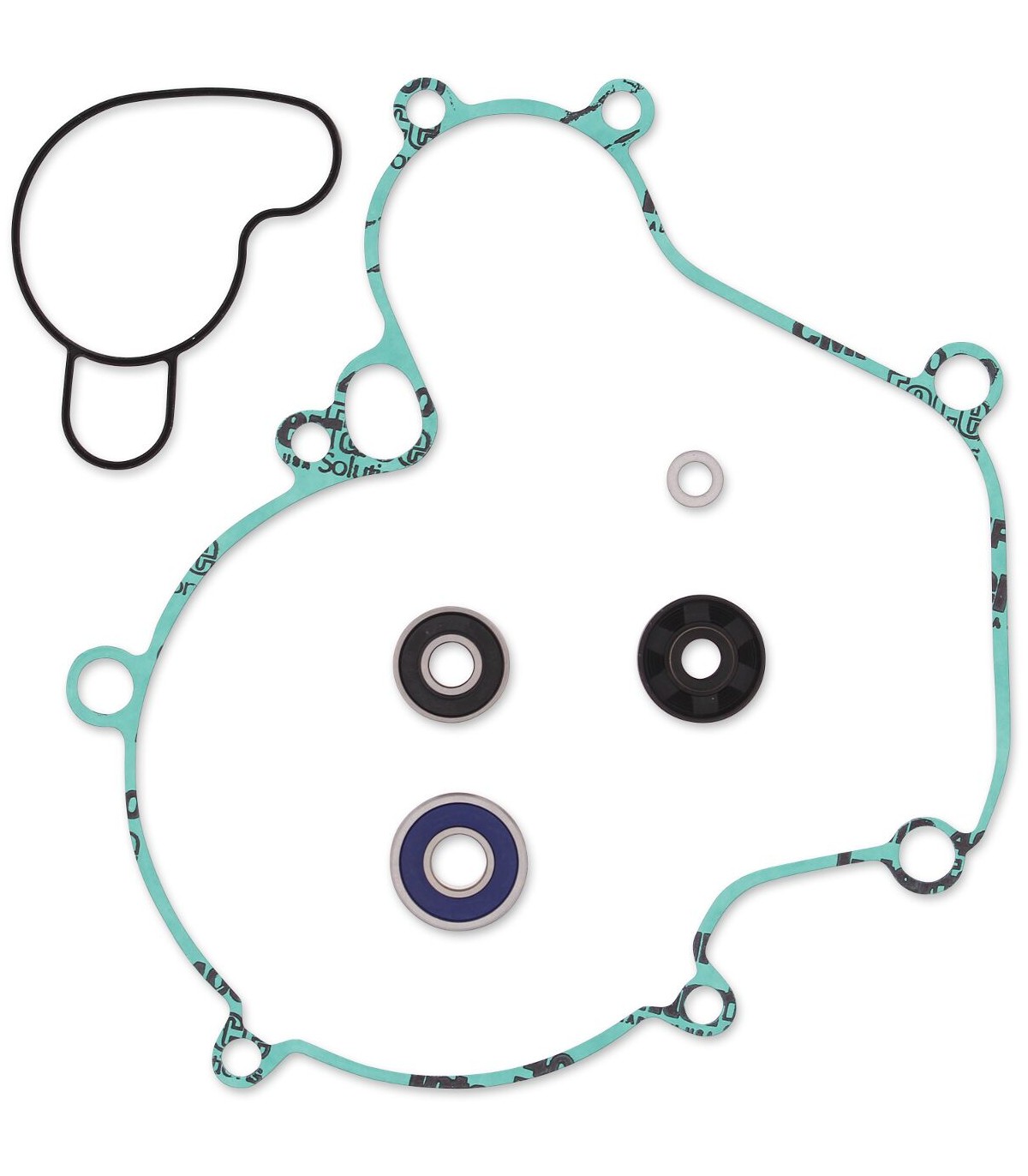 Kit réparation pompe à eauRenferme tous les joints, joints toriques, roulements et joints spy nécessaires pour réparer une pompe à eauLe kit contient les éléments suivants : roulements le cas échéant, joints en caoutchouc, joint de pompe à eau mécanique le cas échéant, joint de carter latéral, joint de pompe à eau, circlips sur l’axe de pompe à eau et joints de vidange en cuivre.