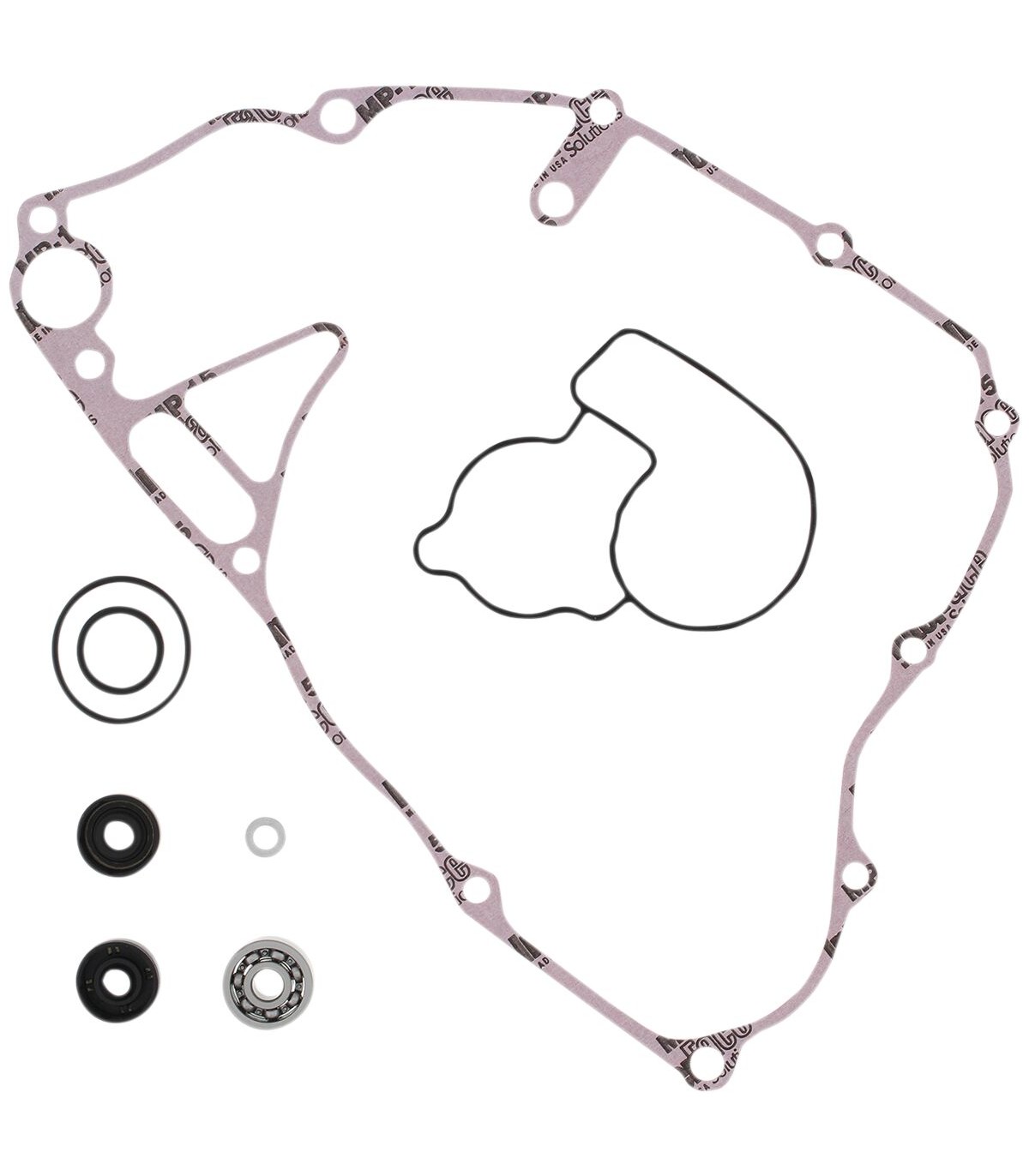 Kit réparation pompe à eauRenferme tous les joints, joints toriques, roulements et joints spy nécessaires pour réparer une pompe à eauLe kit contient les éléments suivants : roulements le cas échéant, joints en caoutchouc, joint de pompe à eau mécanique le cas échéant, joint de carter latéral, joint de pompe à eau, circlips sur l’axe de pompe à eau et joints de vidange en cuivre.