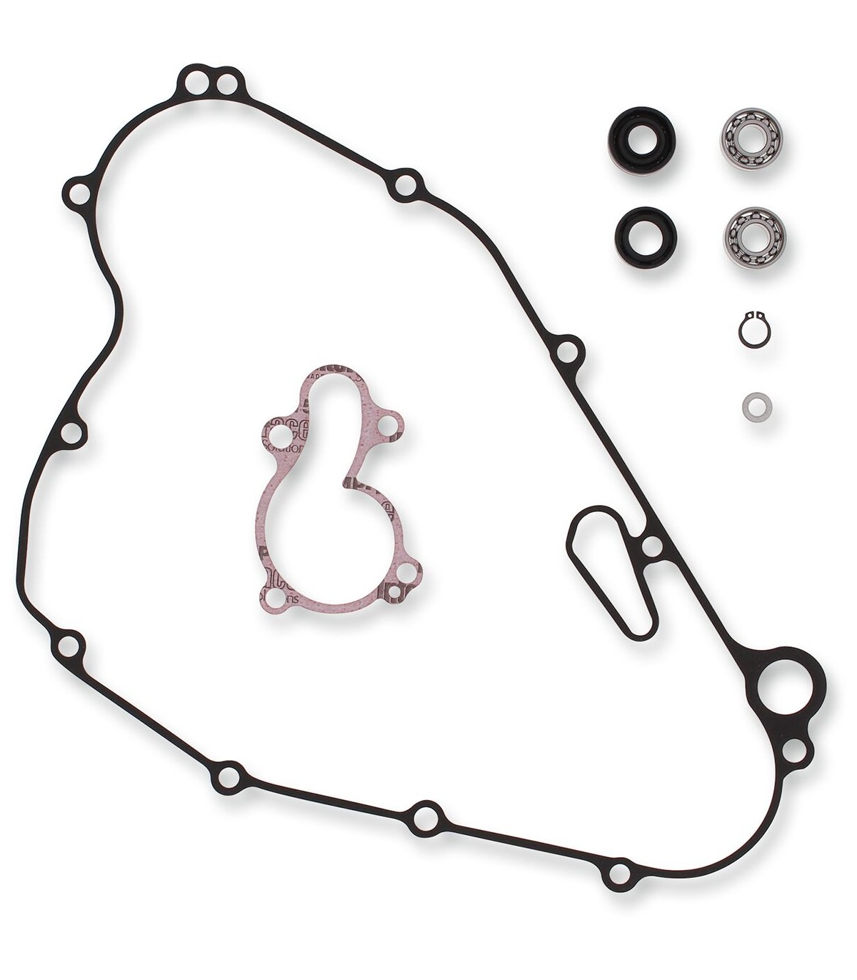 Kit réparation pompe à eauRenferme tous les joints, joints toriques, roulements et joints spy nécessaires pour réparer une pompe à eauLe kit contient les éléments suivants : roulements le cas échéant, joints en caoutchouc, joint de pompe à eau mécanique le cas échéant, joint de carter latéral, joint de pompe à eau, circlips sur l’axe de pompe à eau et joints de vidange en cuivre.