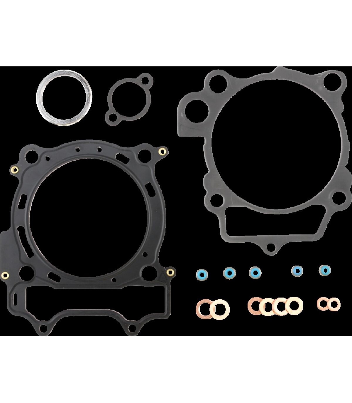 Pochette de joints culasse et embaseLe kit de joints pour haut-moteur inclut les joints d’embase et de culasse et joints toriques de cylindre adéquats ainsi que d’autres joints ou joints toriques propres au haut-moteur nécessaires pour le reconditionnement ou la réparation de ce dernier.Les culasses en MLS permettent une distribution de la charge de couple homogène sur toute la surface d’étanchéité du joint, diminuant ainsi l’altération du cylindre et fournissant une meilleure étanchéité du segment pour obtenir plus de puissanceLes joints de culasse 4 temps sont conçus pour fonctionner sur les machines actuelles à 4 temps, qui disposent de la puissance la plus élevée et qui sont naturellement aspirées et boostées ; ils disposent d'un design en acier multi-couches dont la couche extérieure est estampée et recouverte de caoutchouc Viton ; ces joints de culasse sont conçus pour répondre aux exigences des moteurs actuels, qui disposent de cylindres sous haute pression et d’une puissance élevéeLe kit de joints EST (Extreme Sealing Technology) renferme des joints de culasse, d’embase et de culbuteur en acier inoxydable estampés recouverts d’un caoutchouc exclusif.Le matériau du joint de culasse permet d’éloigner la chaleur du segment de combustion et de la répartir équitablement sur toute la surface du joint, afin d’éliminer les points de chaleur et de prévenir la rupture du jointFabrication aux États-UnisContains EST gaskets.