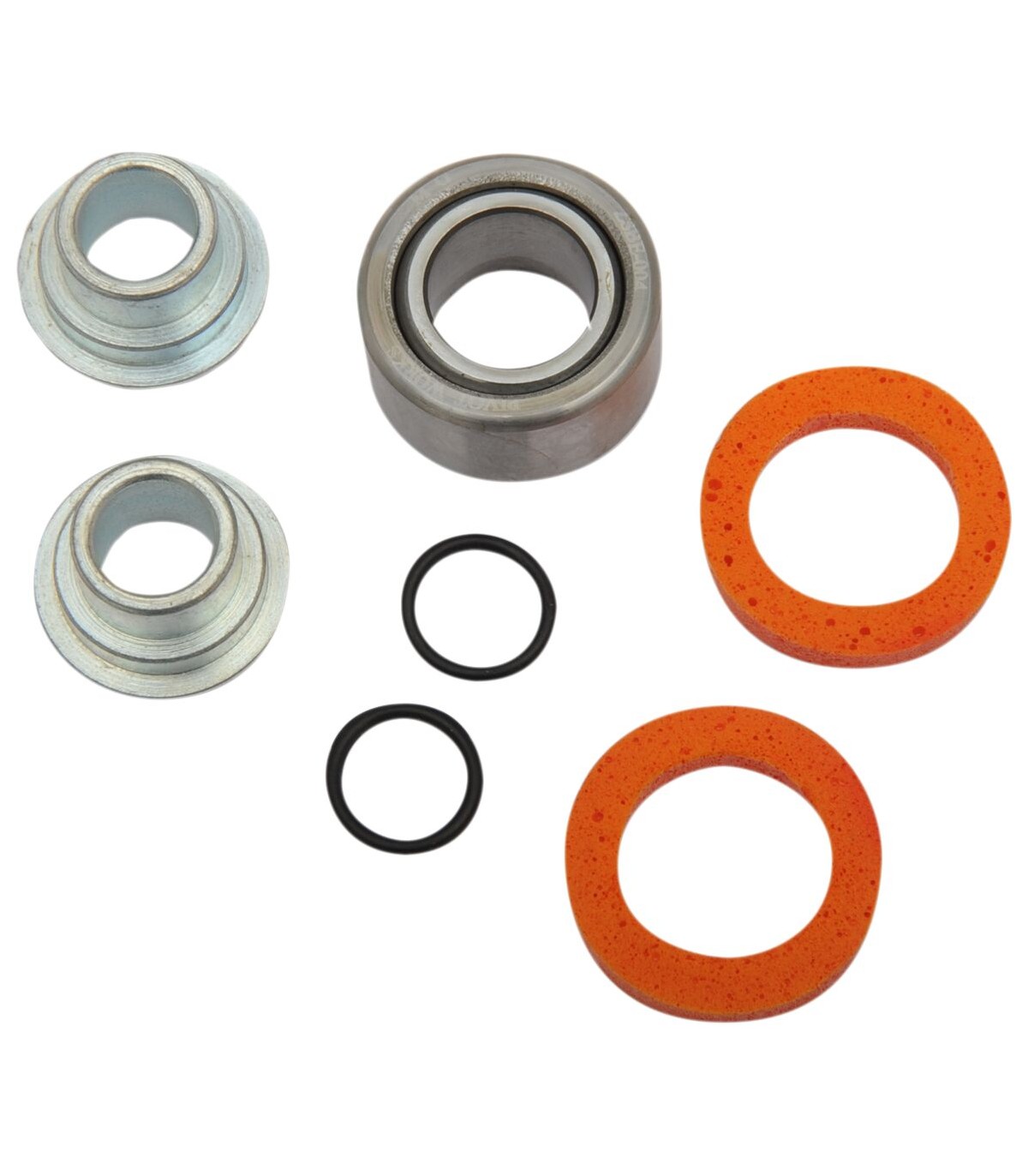 Kit de roulement d'amortisseurLe kit contient deux roulements sphériques PTFE (roulements à segmentation articulée), quatre joints et les composants associésChaque kit d’amortisseur recrée les deux extrémités de l’amortisseurCertains amortisseurs sur les modèles Kawasaki et Honda utilisent une goupille pour raccorder amortisseur à la biellette. Le roulement, la bague et les joints qui sont enfoncés dans la biellette sont inclus dans les kits d’amortisseurs Pivot Works.