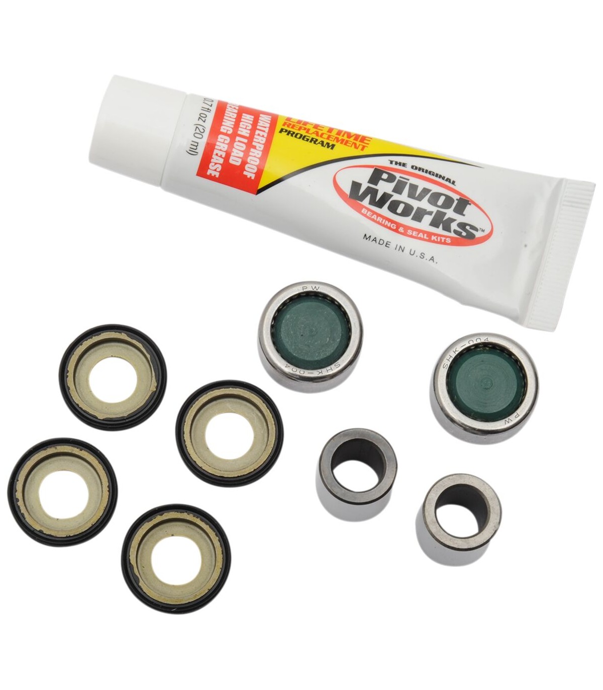 Kit de roulement d'amortisseurLe kit contient deux roulements sphériques PTFE (roulements à segmentation articulée), quatre joints et les composants associésChaque kit d’amortisseur recrée les deux extrémités de l’amortisseurCertains amortisseurs sur les modèles Kawasaki et Honda utilisent une goupille pour raccorder amortisseur à la biellette. Le roulement, la bague et les joints qui sont enfoncés dans la biellette sont inclus dans les kits d’amortisseurs Pivot Works.