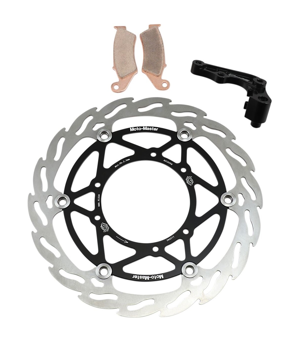 Kit de freins à disque flottant Flame surdimensionné 270 mmDisque flottant surdimensionné avant MX avec support anodisé noir marqué au laser léger en acier inoxydable et disque Flame inoxydable d'un diamètre de 270 mmAdaptateur de déport d'étrier assorti en billette d'aluminium aéronautique usiné CNC, anodisé noir et marqué au laserUn kit de frein avant très puissant et contrôlable, en particulier lorsqu'il est utilisé combiné à nos plaquettes de frein composées RacingLe kit surdimensionné le plus fréquemment utilisé avec le Racing MXGPLe kit contient : un disque de frein surdimensionné de 270 mm, un adaptateur de repositionnement d'étrier et un kit de plaquettes de frein avant composées Racing Moto Master Nitro SportOffre une amélioration des performances de 35 % par rapport à la version d'origineLe design léger offre un gain de poids de 20 %Le design Flame offre un refroidissement optimal et un freinage souple et plus prévisible, vous permettant de freiner plus fort