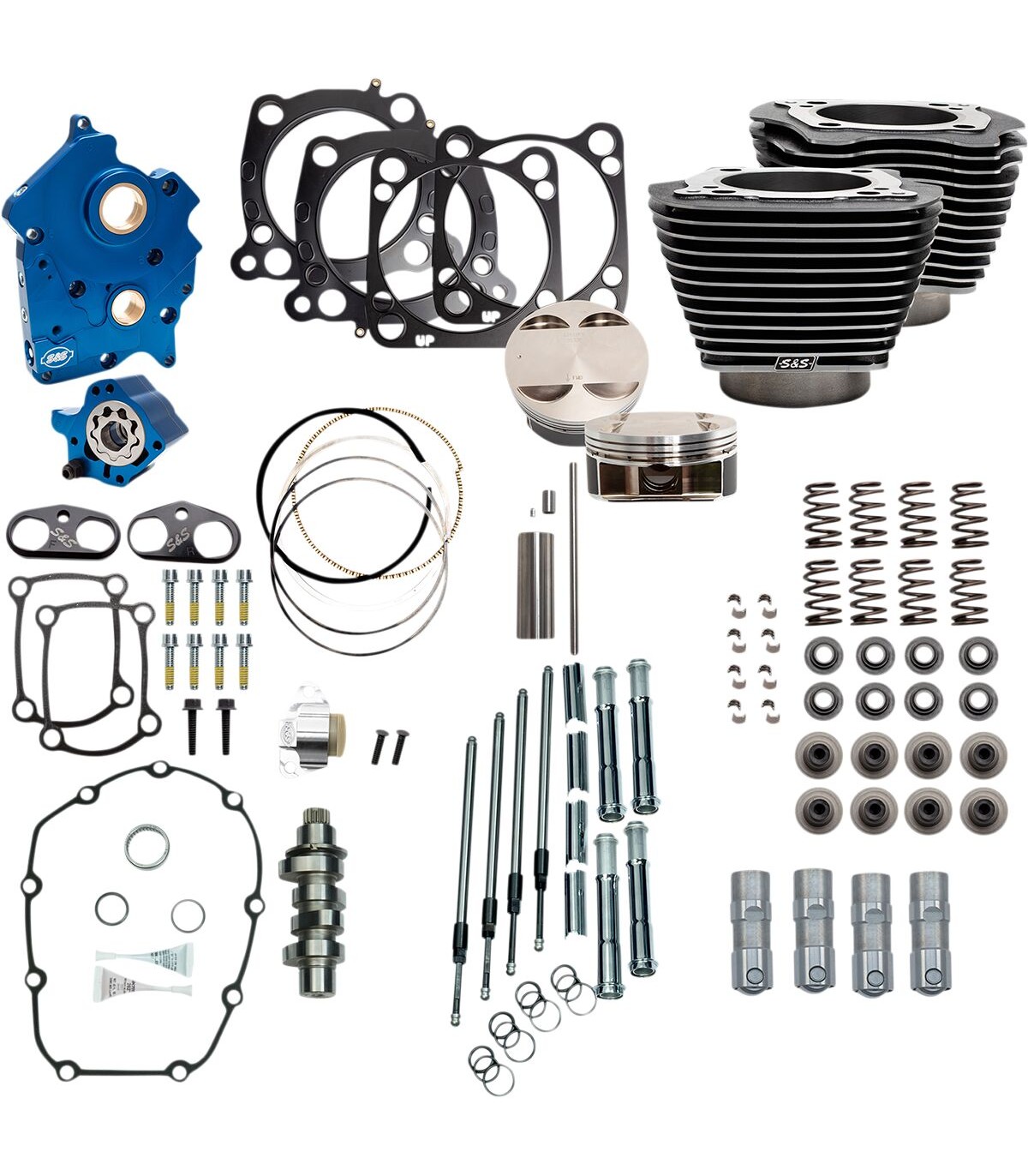 Kit performance pour moteur 128" Power PackageLe kit de fixation par vis big bore permet de transformer un moteur M-Eight de 114"/117" avec course de 4-1/2" sans qu’il soit nécessaire d’usiner le carter.Cylindres à alésage de 4-1/4" avec pistons forgés 11:1Platine de support pour pompe à huile/arbre à cames S&S avec finition anodisée bleueBouchons amovibles pour un entretien plus facileSections de récupération indépendantes pour le bas-moteur et le carter de distributionFiltre à débris dans les deux détecteurs de récupérationL’aimant dans le carter de distribution empêche que les débris pénètrent dans la pompe à huile.Capacité de débit d’huile accrue à la fois côté alimentation et côté récupérationLe clapet de pression peut être ajusté à l’aide de l’unité installée dans le moteur.Tiges-poussoir Quickee avec tubes chromésPoussoirs S&S de qualité supérieureLes manchettes avec revêtement noir à anodisation dure S&S sont en aluminium taillé dans la masse.Stabilité des poussoirs améliorée en cas de haute levée et de haut régimeCames 550 S&S conçues pour les applications big boreLes ressorts de soupape S&S sont compatibles avec les cames présentant une levée maximale de 0,605".Ressort conique à fil simple hautes performancesL’ensemble des joints, des roulements et du matériel requis pour la fixation par vis est fourni.Fabrication aux États-UnisNon recommandé pour les modèles Tri-Glide ou les autres modèles à trois roues (y compris convertis) en raison du manque de reprise de ces véhicules