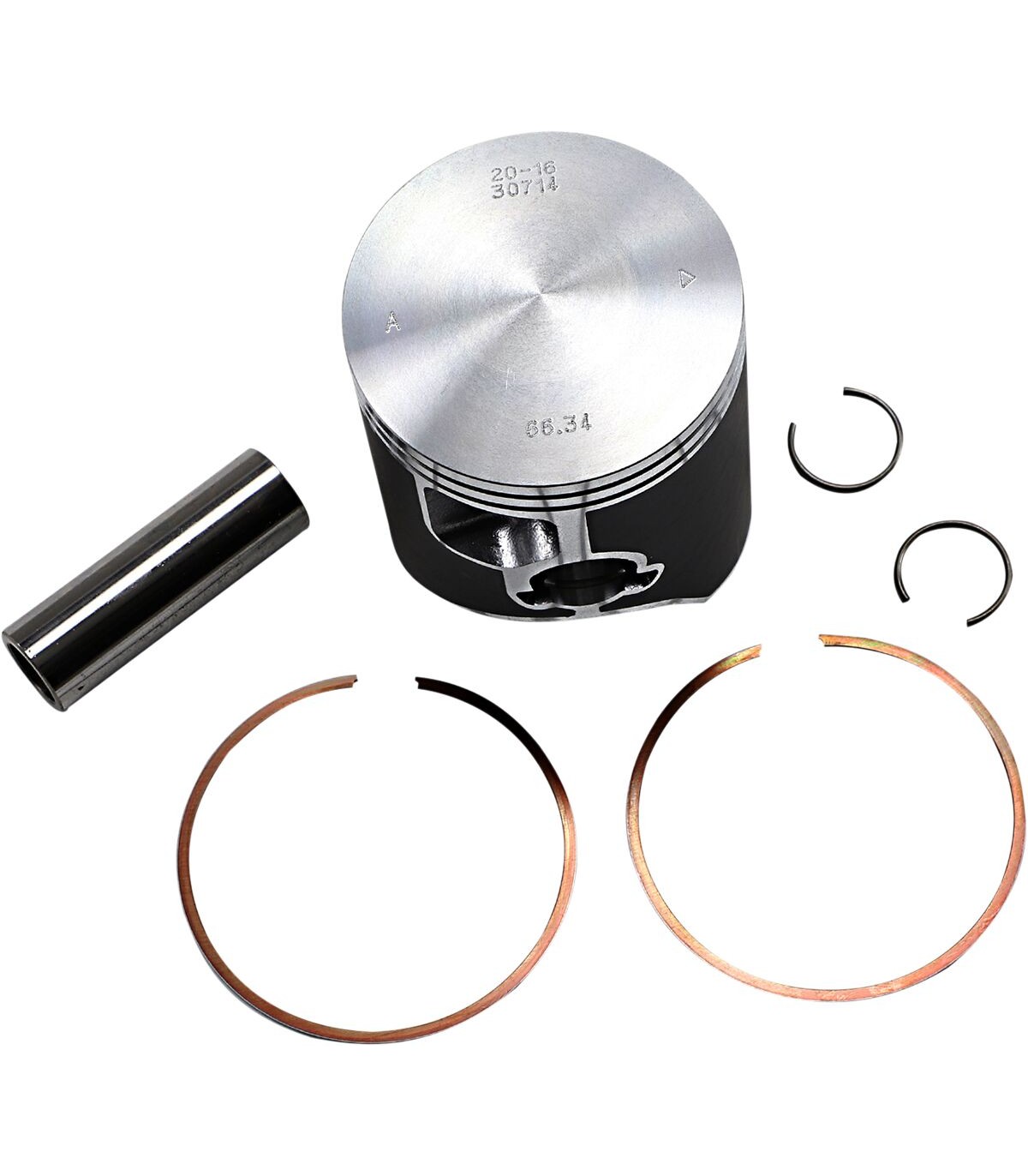 Piston Kit Cast Replica for 2 StrokePiston is heat treated with a T-5 hardening and tempering cyclePiston skirt is coated with a high-tech Molybdenum Disulphite coating for faster break-in time and increased piston lifeGravity-cast aluminum alloy (not forged) with 18% silicone contentCast OE replacement pistonKit includes piston, rings, wrist pin and circlipsKit Includes: