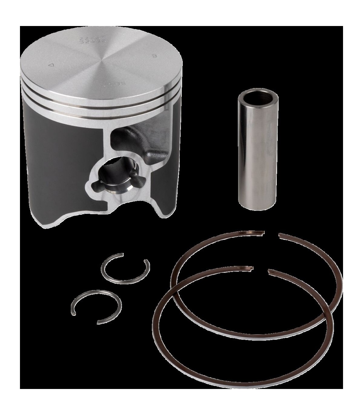 Piston Kit Cast Replica for 2 StrokePiston is heat treated with a T-5 hardening and tempering cyclePiston skirt is coated with a high-tech Molybdenum Disulphite coating for faster break-in time and increased piston lifeGravity-cast aluminum alloy (not forged) with 18% silicone contentCast OE replacement pistonKit includes piston, rings, wrist pin and circlipsKit Includes: