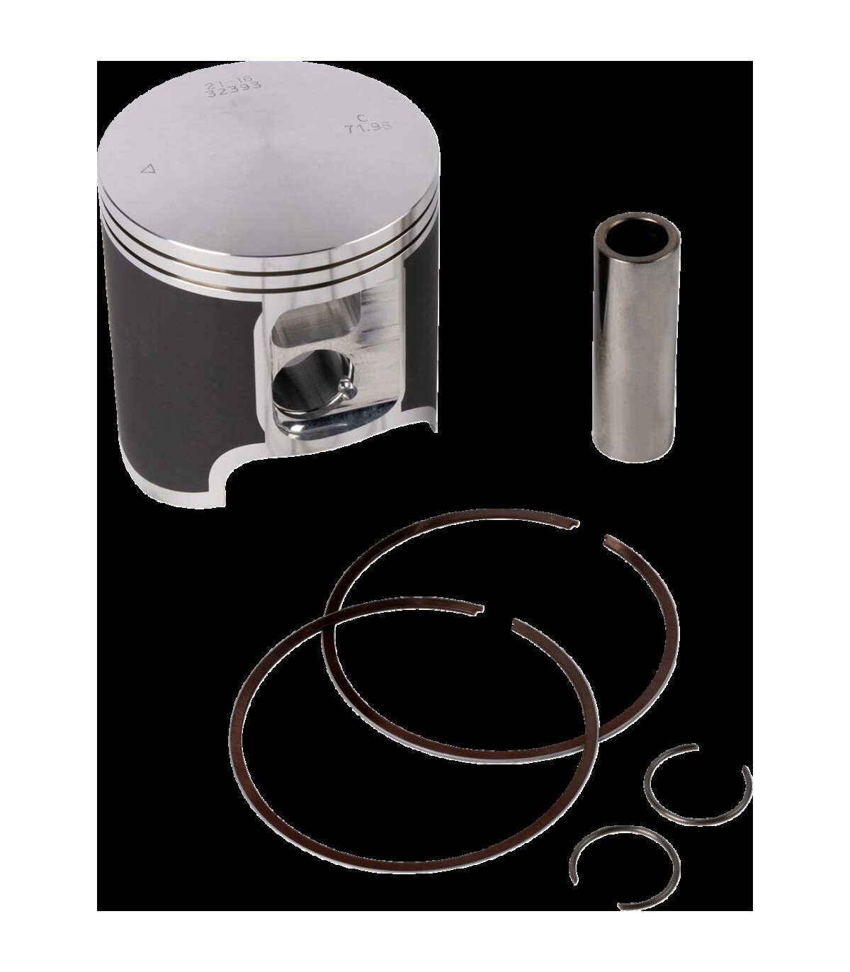 Piston Kit Cast Replica for 2 StrokePiston is heat treated with a T-5 hardening and tempering cyclePiston skirt is coated with a high-tech Molybdenum Disulphite coating for faster break-in time and increased piston lifeGravity-cast aluminum alloy (not forged) with 18% silicone contentCast OE replacement pistonKit includes piston, rings, wrist pin and circlipsKit Includes: