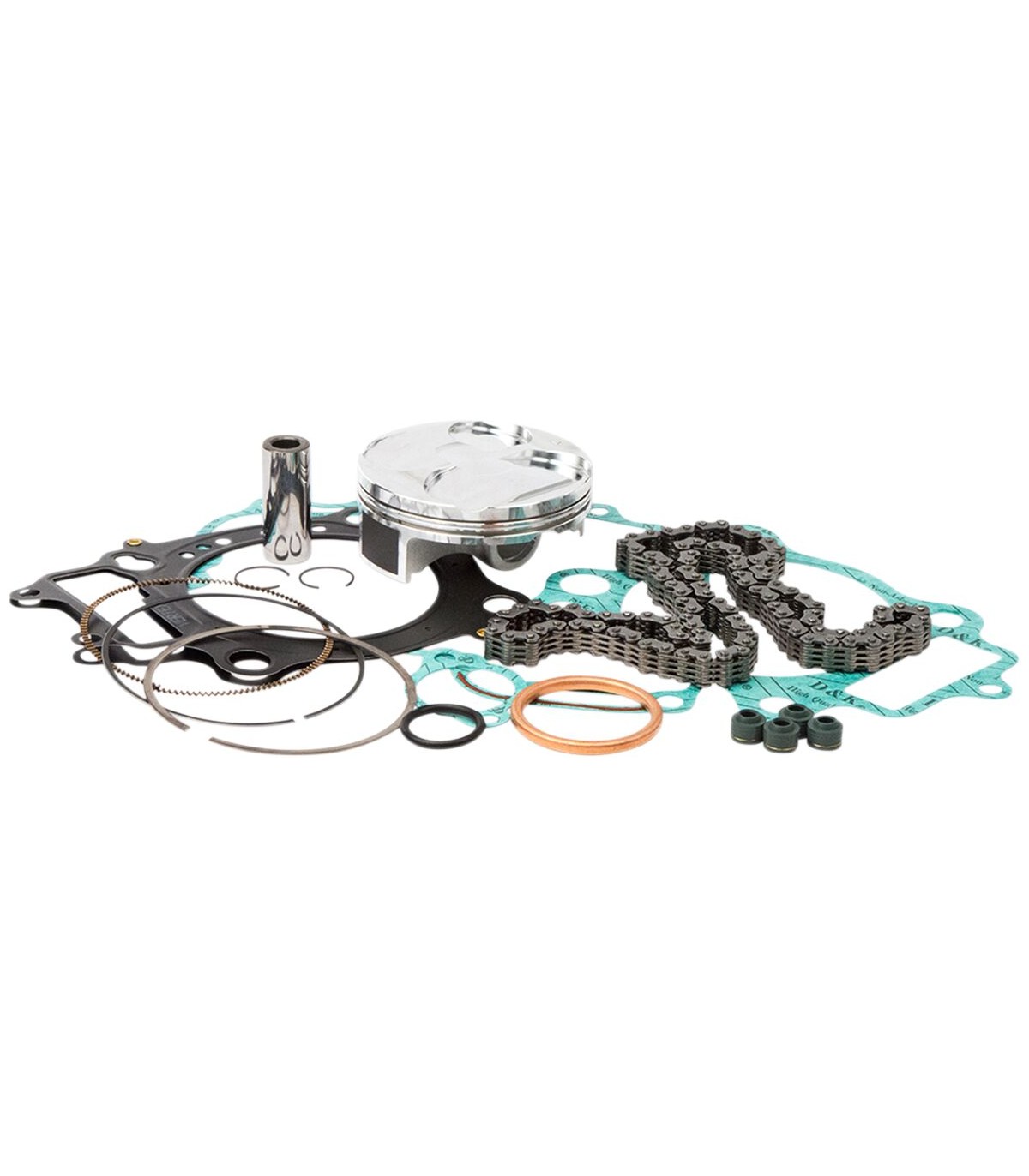 Top End Piston Kit Forged Replica for 4-StrokeThe piston is heat-treated with a T-5 hardening and tempering cycleThe piston skirt is coated with high-tech Molybdenum Disulphite to allow faster break in time and increased piston lifeForged piston kit is forged from 2618 aluminumForged replica piston is a forged OEM replacementTop-end piston kit includes piston, rings, pins, circlips, top-end gaskets and cam chainKit Includes: