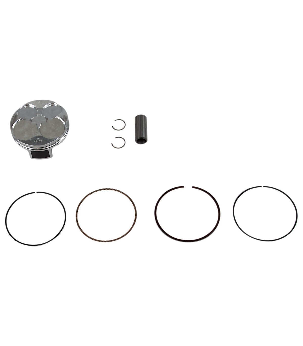 Piston Kit Forged High Compression for 4-StrokeThe piston is heat-treated with a T-5 hardening and tempering cycleThe piston skirt is coated with a high-tech Molybdenum Disulphite coating for faster break in time and increased piston lifeForged high compression piston improves power and torque across entire rpm rangePiston kit includes piston, rings, wrist pin and circlips