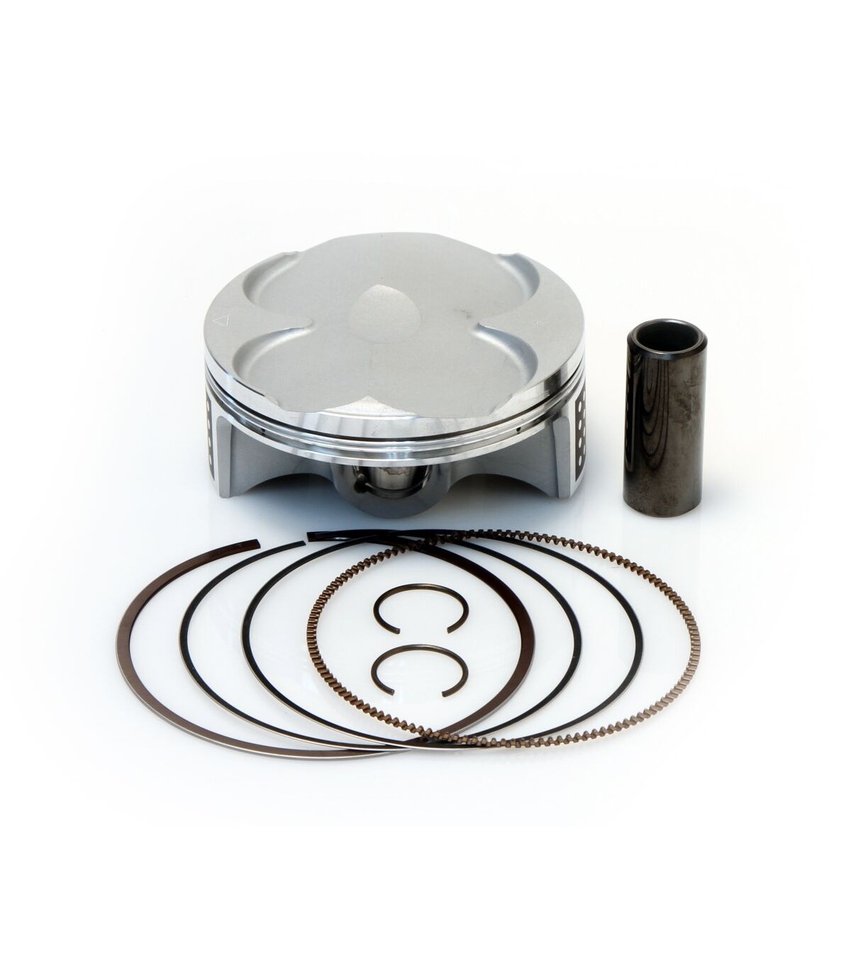 Kit de piston (forgé/à haute compression)Pro-HC – Piston forgé développé avec la technologie Vertex et compression hauteTous les pistons sont traités thermiquement avec un cycle de renforcement et de durcissement T-5Les jupes sont traitées avec un revêtement en Molybdène disulfide high-tech pour un rodage plus rapide et une durée de vie du piston amélioréeLes pistons sont forgés à partir d’aluminium 2618 pour une endurance et une durée de vie supérieuresEn raison de la compression plus élevée, la puissance et le couple peuvent être améliorés sur toute la plage de régimeLes kits comprennent le piston, les segments, l’axe de piston et les circlipsSegments 2 temps de rechange vendus à l’unité ; segments 4 temps vendus par lot