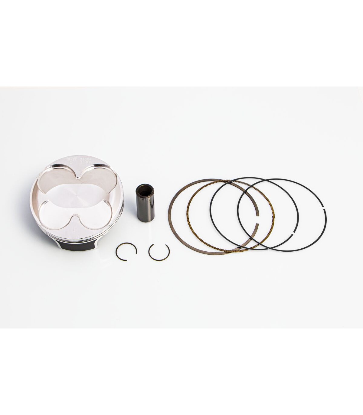 Kit de piston (forgé/réplique)Pro-Replica – Piston forgé de forme d’origineTous les pistons sont traités thermiquement avec un cycle de renforcement et de durcissement T-5Toutes les jupes sont traitées avec un revêtement en Molybdène disulfide high-tech pour un rodage plus rapide et une durée de vie du piston amélioréeLes pistons sont forgés à partir d’aluminium 2618 pour une endurance et une durée de vie supérieuresLes pistons Replica sont des pièces de rechange d’origine forgéesLes pistons Replica et tous les segments sont des pièces de rechange d’origineLes kits comprennent le piston, les segments, l’axe de piston et les circlipsSegments 2 temps de rechange vendus à l’unité ; segments 4 temps vendus par lot