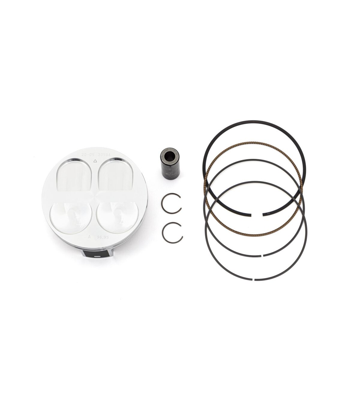 Kit de piston (forgé/à haute compression)Pro-HC – Piston forgé développé avec la technologie Vertex et compression hauteTous les pistons sont traités thermiquement avec un cycle de renforcement et de durcissement T-5Les jupes sont traitées avec un revêtement en Molybdène disulfide high-tech pour un rodage plus rapide et une durée de vie du piston amélioréeLes pistons sont forgés à partir d’aluminium 2618 pour une endurance et une durée de vie supérieuresEn raison de la compression plus élevée, la puissance et le couple peuvent être améliorés sur toute la plage de régimeLes kits comprennent le piston, les segments, l’axe de piston et les circlipsSegments 2 temps de rechange vendus à l’unité ; segments 4 temps vendus par lot