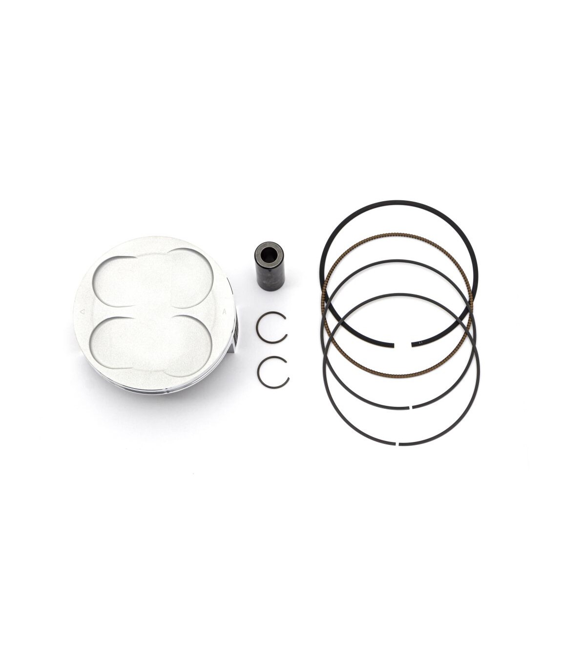 Kit de piston (forgé/à haute compression)Pro-HC – Piston forgé développé avec la technologie Vertex et compression hauteTous les pistons sont traités thermiquement avec un cycle de renforcement et de durcissement T-5Les jupes sont traitées avec un revêtement en Molybdène disulfide high-tech pour un rodage plus rapide et une durée de vie du piston amélioréeLes pistons sont forgés à partir d’aluminium 2618 pour une endurance et une durée de vie supérieuresEn raison de la compression plus élevée, la puissance et le couple peuvent être améliorés sur toute la plage de régimeLes kits comprennent le piston, les segments, l’axe de piston et les circlipsSegments 2 temps de rechange vendus à l’unité ; segments 4 temps vendus par lotCompression: 13,45:1