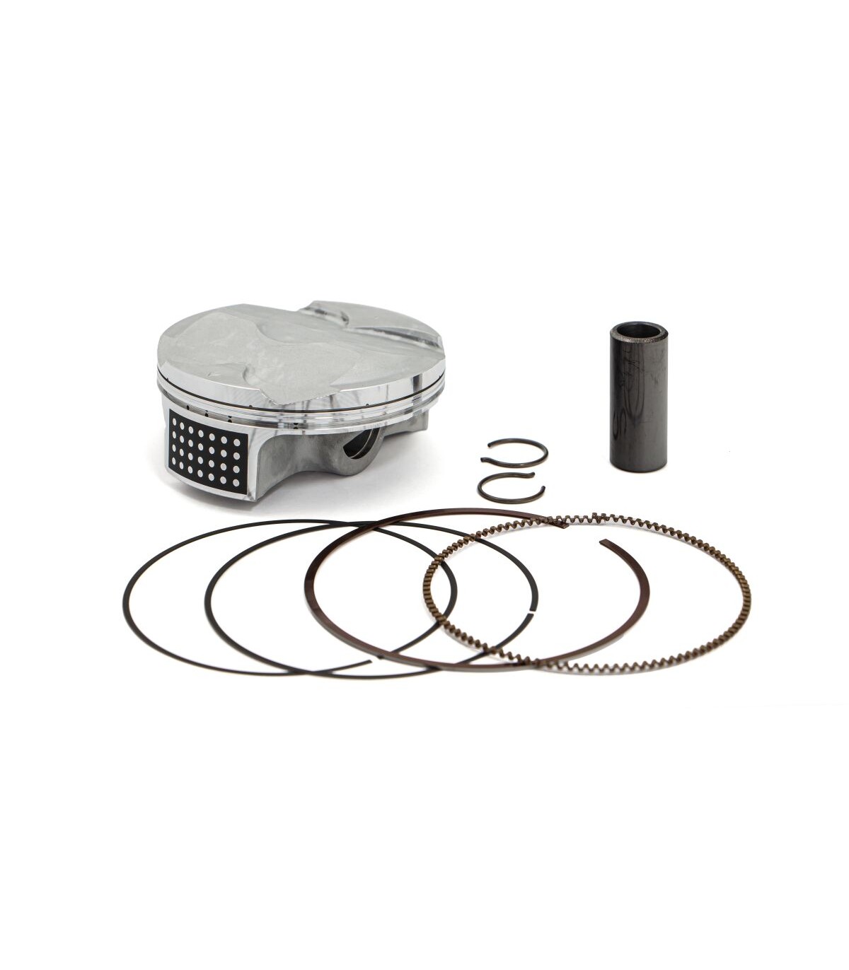 Piston Kit (GP Racer's Choice)GP Racer's Choice pistons have T-box forgings, unique dome profiles, surface treatments, and increased compression ratios to produce more power, strength, and durabilityAll pistons are heat-treated with a T-5 hardening and tempering cycleAll piston skirts are coated with a high-tech Molybdenum Disulphite coating for faster break-in time and increased piston lifeForged pistons are forged from 2618 aluminum for superior strength and durabilityKits include piston, rings, wrist pin and circlipsReplacement two-stroke piston rings sold individually; four stroke piston rings sold as a set