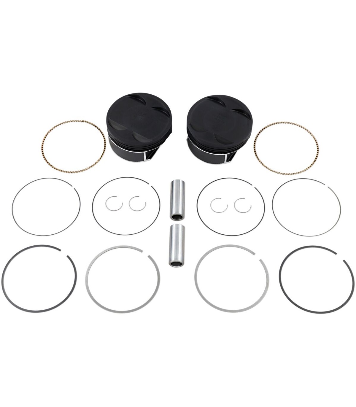 Piston KitFeature ArmorX™ piston coating for superior protection in extreme conditions and reduced wearArmorFit™ skirt coating auto-adjusts to the cylinder wall so there’s no need to measure clearance; provides smooth, quiet, trouble-free operationDome design for improved flame travel to maximize air/ fuel burn efficiencyHigh compression (11:1) for added powerSuperfinish piston pin reduces friction and improves scuff resistanceEnhanced pin oiling for improved lubrication and reduced frictionAugmented ring land details improve ring seal and functionDedicated rings for precise fit, improved compression and oil controlFit OEM and Screamin’ Eagle cylinder headsKit includes two pistons, rings, piston pins and circlipsMade in the U.S.A