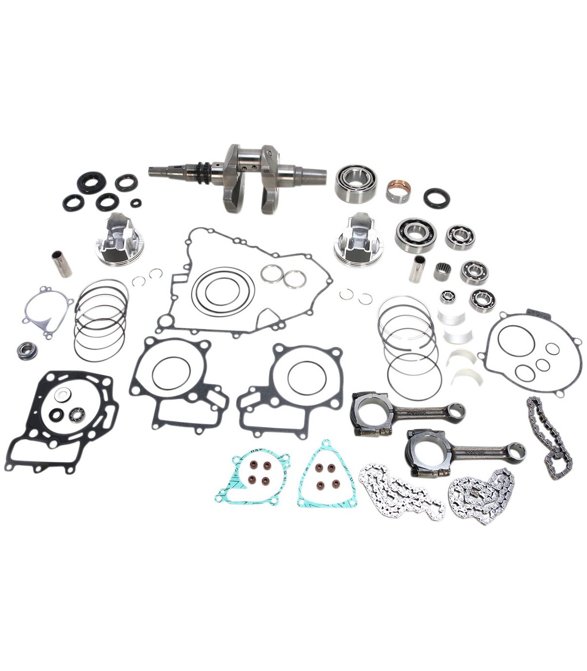 Kit de reconditionnement pour moteurKit de reconditionnement complet pour le moteurInclus : vilebrequin, kit de piston, kit de joint moteur complet avec joints spy, roulements de vilebrequin et joints, kit réparation de pompe à eau, roulements de transmission, bague de pignon/kit de joint, cage à aiguille d’axe de piston, chaîne de distKit Includes: