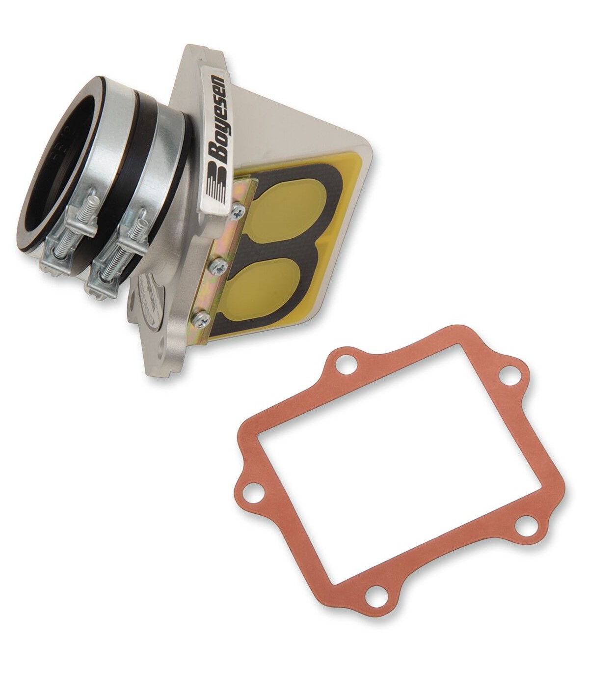 Boîte à clapetsMaintien de la vitesse de débit traversant la valve et redirection de la charge d'admission pour une distribution homogène des ports d'admissionFixation facile en aluminium couléRéponse à l'accélérateur plus rapide et plus précise et plus grande puissance sur toute la plage de régimesLa cage spécialement conçue maintient les lamelles de clapet brevetées à deux temps de BoyesenLes boîtes à clapets de Boyesen augmentent votre couple