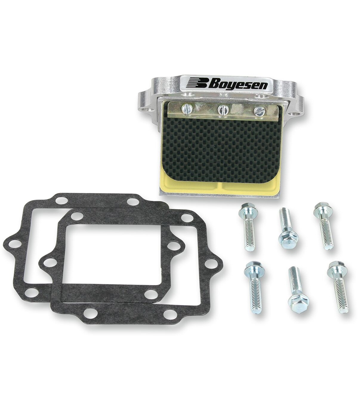 Boîte à clapetsMaintien de la vitesse de débit traversant la valve et redirection de la charge d'admission pour une distribution homogène des ports d'admissionFixation facile en aluminium couléRéponse à l'accélérateur plus rapide et plus précise et plus grande puissance sur toute la plage de régimesLa cage spécialement conçue maintient les lamelles de clapet brevetées à deux temps de BoyesenLes boîtes à clapets de Boyesen augmentent votre couple