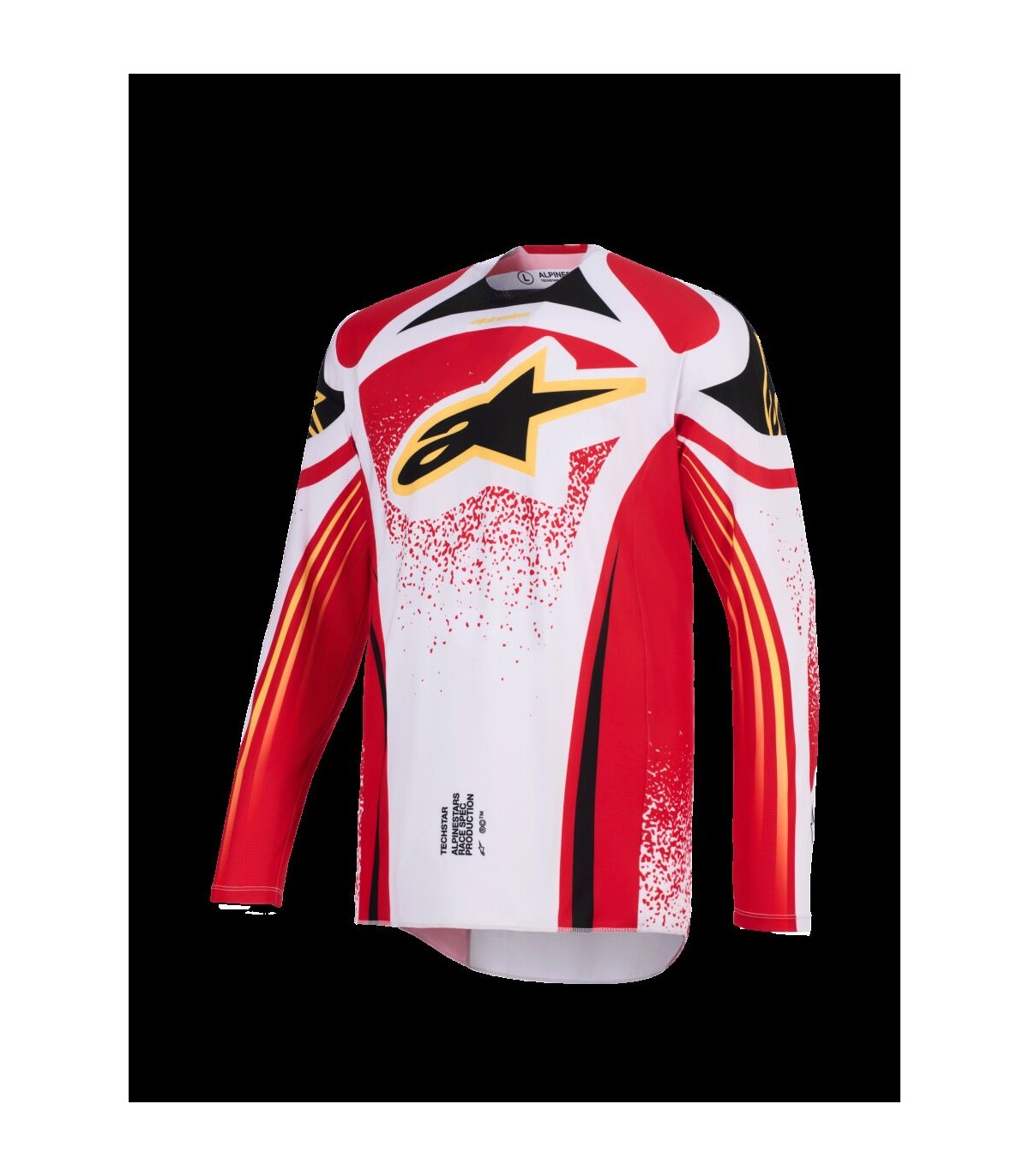 Techstar Nomur JerseyTechstar Nomur Jersey is constructed from lightweight, high durable, stretch fabric with a moisture-wicking treatment for comfort and performance.Ergonomically engineered cut and optimized racing multi-panel pattern for enhanced freedom of movement and mobility.Incorporated laser-cut perforations on chest and arms for ventilation.Strategically positioned stretch inserts for superior freedom of movement.Flat stretch construction on arms and shoulders for range of movement and rider comfort.Innovative construction utilizes no side seams and no underarm seams for comfort.Seamless bonded collar for ease of use and enhanced comfort and seamless bonded cuffs.Rear is extended for greater coverage in riding position and compatibility with Alpinestars' MX pants.