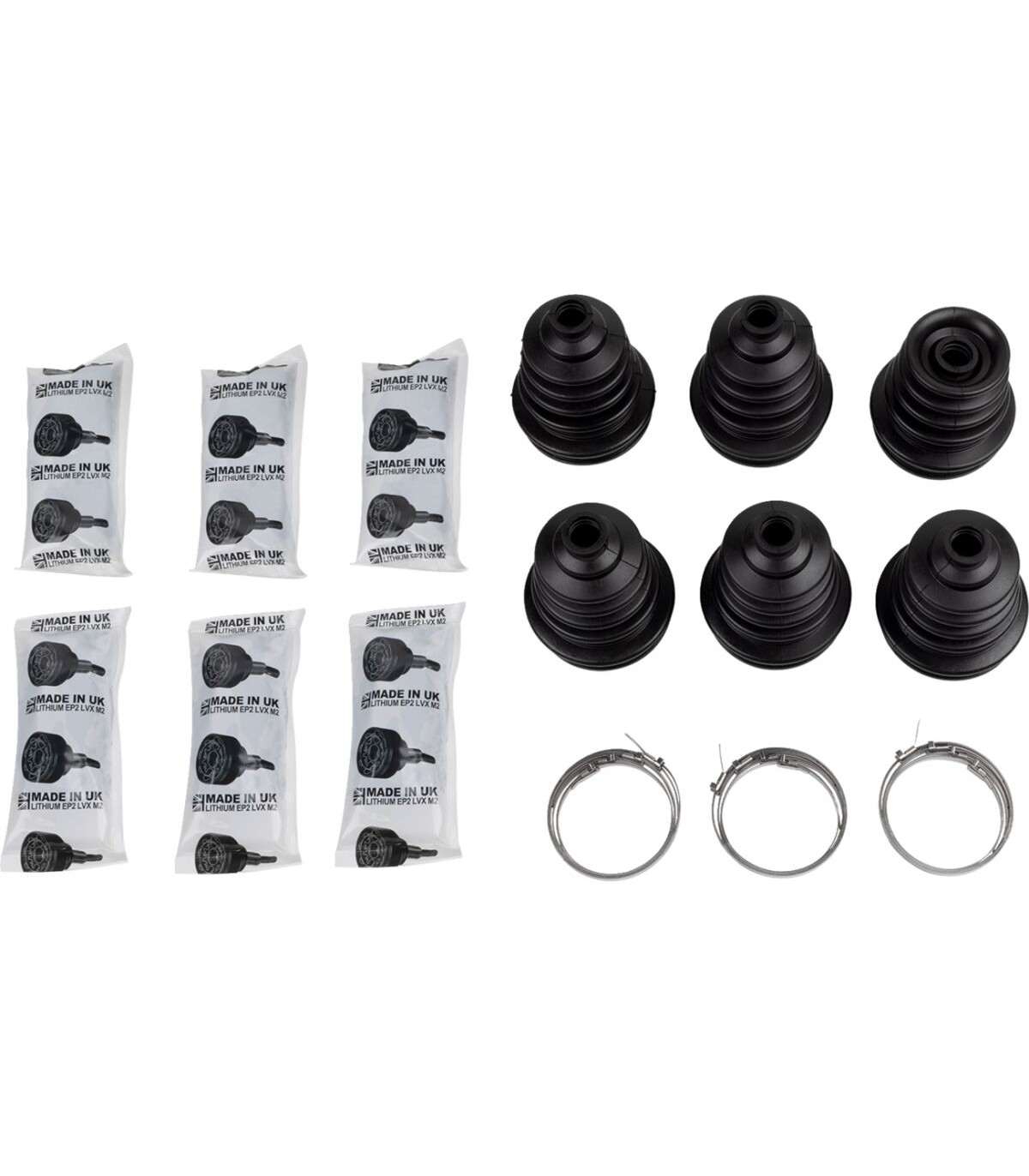 Fast Boot IIUn Fast Boot II couvre tous les quads – axes avant et arrière, cardans côté pont et côté roueVente à l'unité dans un kit comprenant un soufflet, 80 grammes de graisse, deux clamps, un outil d’installation de clamp (clé hexagonale avec fente) et instructions détailléesBord intérieur carré permettant de maintenir la cannelure de support de clamp en position verticaleLa nervure supplémentaire permet au soufflet de s’étendre pour les cardans pour largesSoufflet de cardan pour quad compatible avec presque tous les quadsEn caoutchouc néoprène le plus finCannelures de support de clamp amélioréesFabrication aux États-Unis.