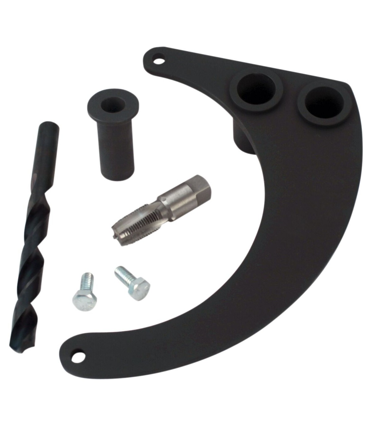 Patron de perçage pour carter de transmissionPatron de perçage servant à localiser les trous pour le perçage et le taraudage du carter moteur sur les modèles touring lors de l’installation d’un moteur T-Series avec le kit d’adaptation de durite d’huile 310-0435Fabrication aux États-Unis
