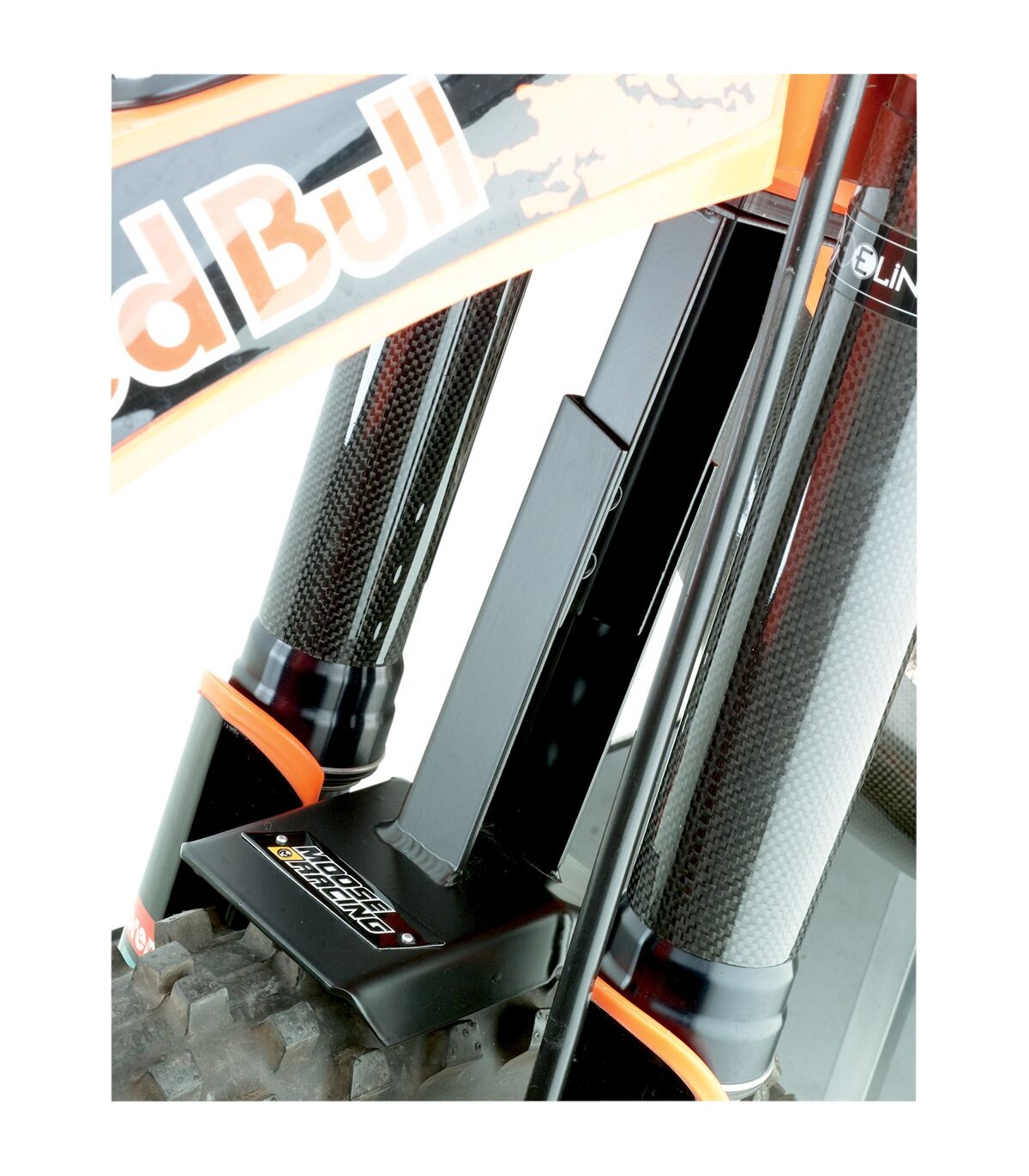 Housse de fourcheDesign cintré unique conçu pour accrocher le profil du pneu tout-terrain tandis que la partie supérieure en caoutchouc s'accroche aux boulons du garde-boue pour le maintenir en place pendant le transportQuatre longueurs ajustables pour s’adapter aux mini-motos comme aux motos de taille normaleAugmente la durée de vie du joint spy de fourche et des ressorts de fourche
