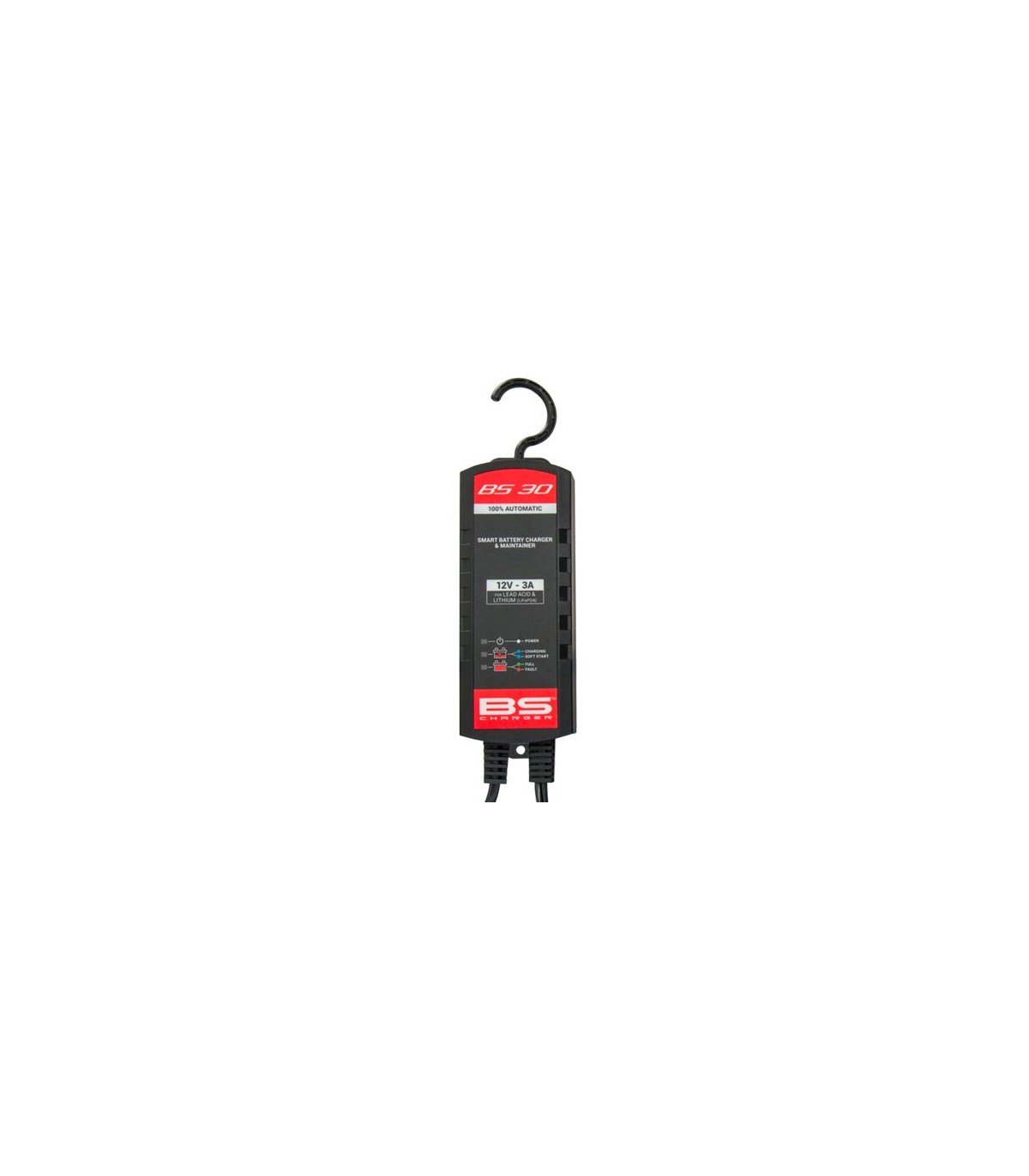 BS30 Charger UK-Plug12V smart battery charger and maintainer rated at 3A.Designed for lead acid and lithium batteries.Suitable for batteries up to 60Ah.Safe and easy to use with 9 stages of charge to enhance performance of powersport & garden batteries.Easy to use: connect & forgetAuto detect Lead Acid or Lithium technologySafe: connection spark free, reverse polarity, short circuit and internal overheat protectionSaves your dead battery from as low as 2VAdaptable charging algorithm for Lead Acid & Lithium (LiFePO4)1 BS clamps set and 1 fused ring terminal set.Multiaxis hookUK Plug.